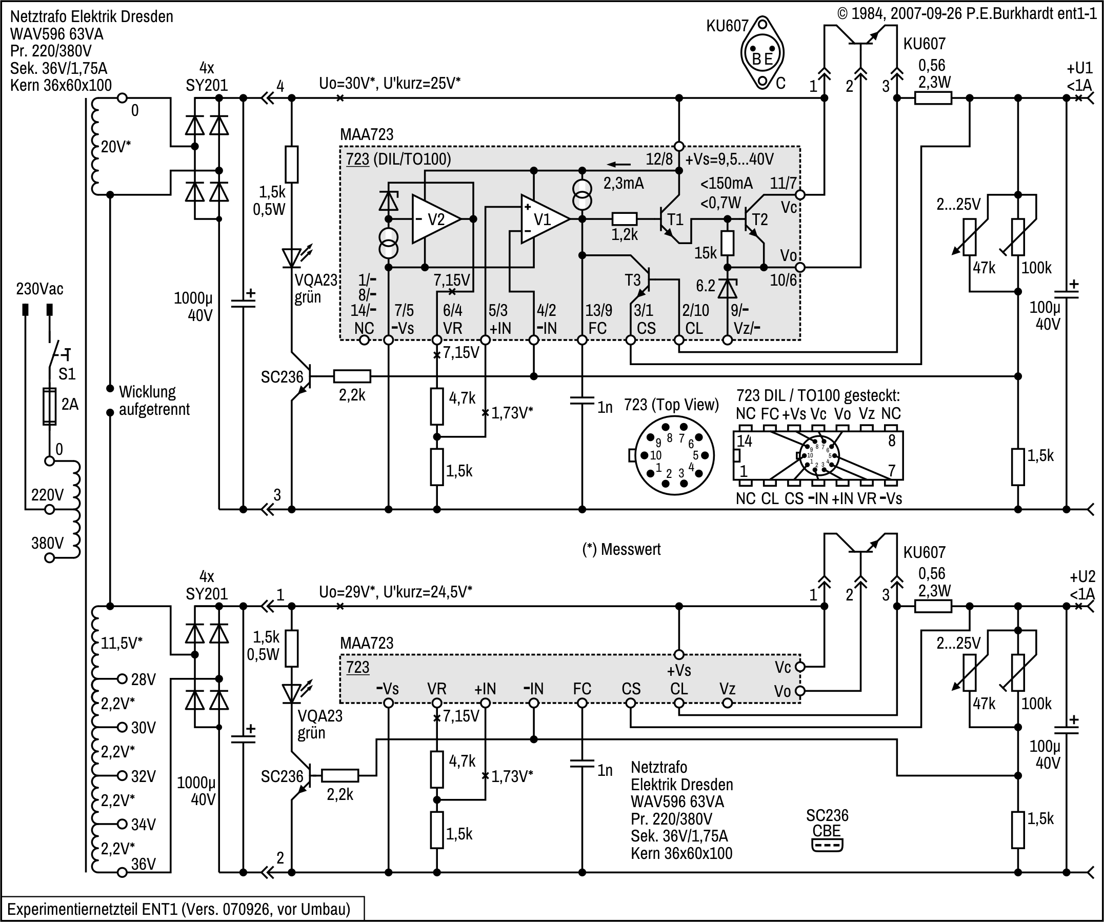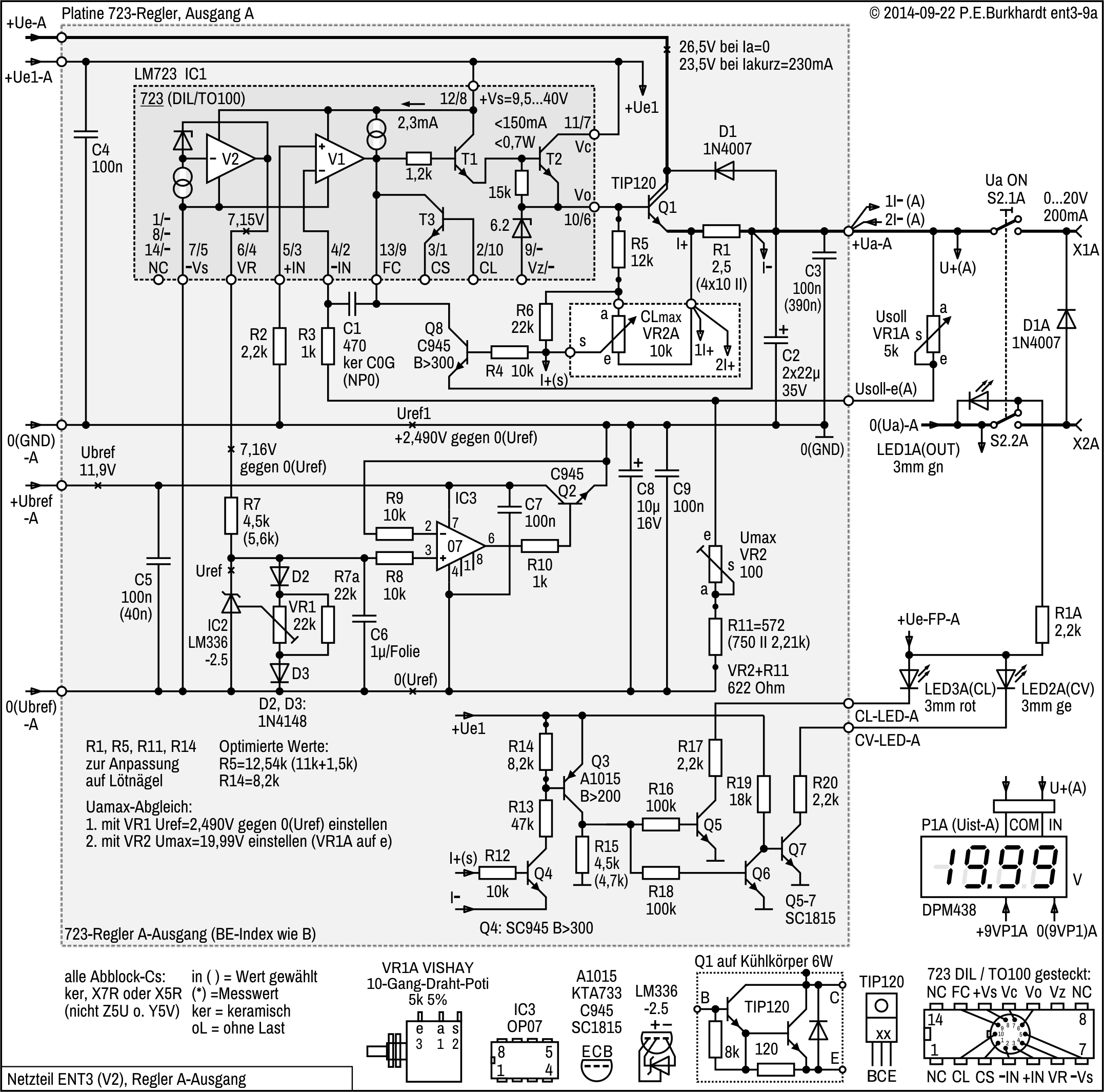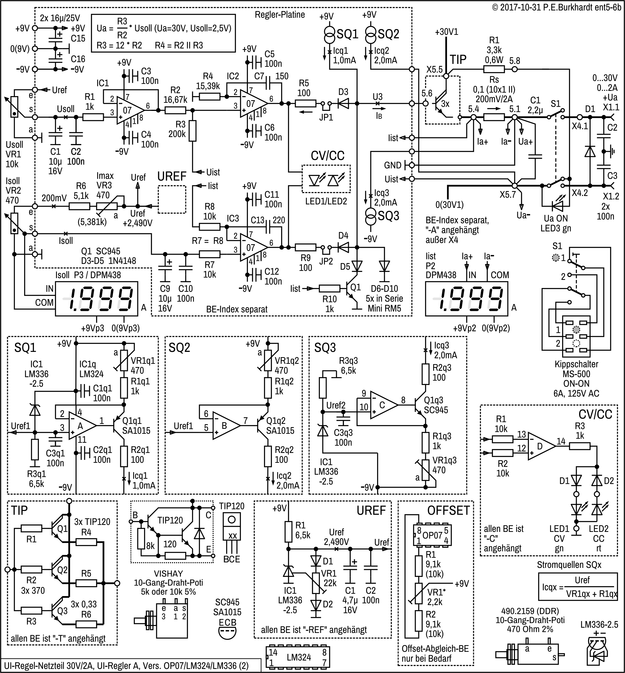 Die genannten Schaltungsteile basieren auf den weiter oben beschriebenen 723-Schaltungen (Ua einstellbar ab Null Volt).