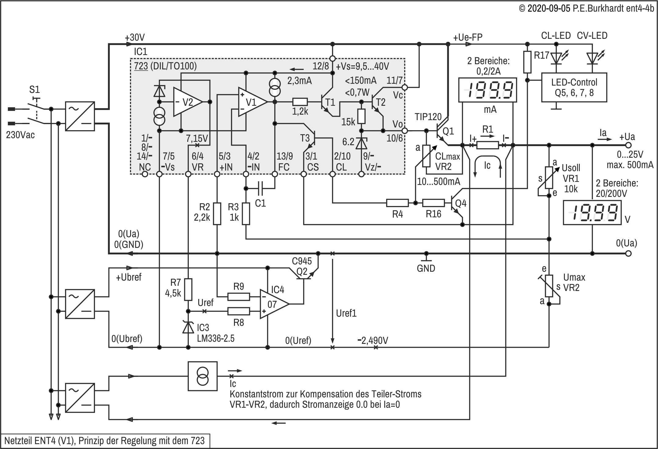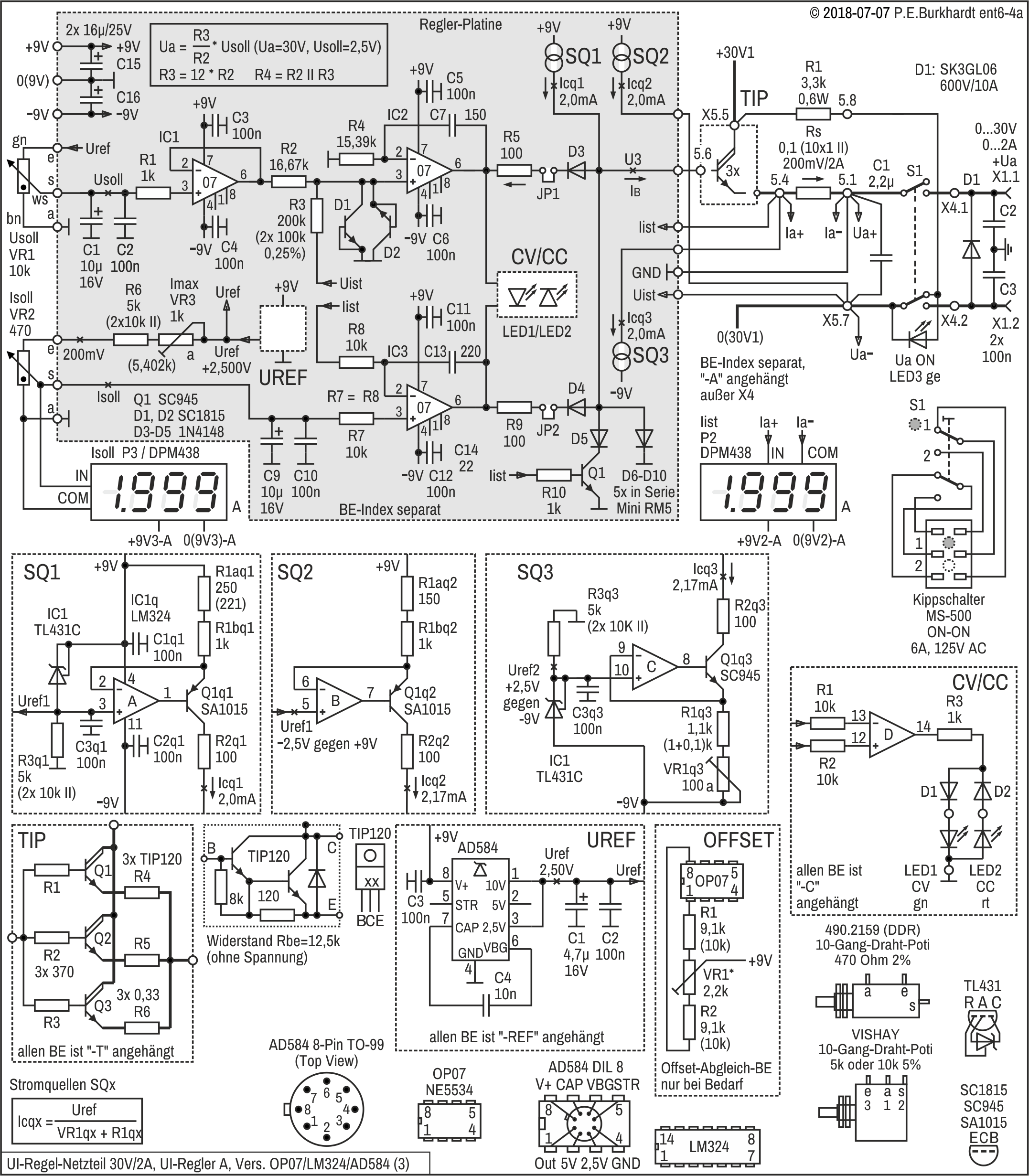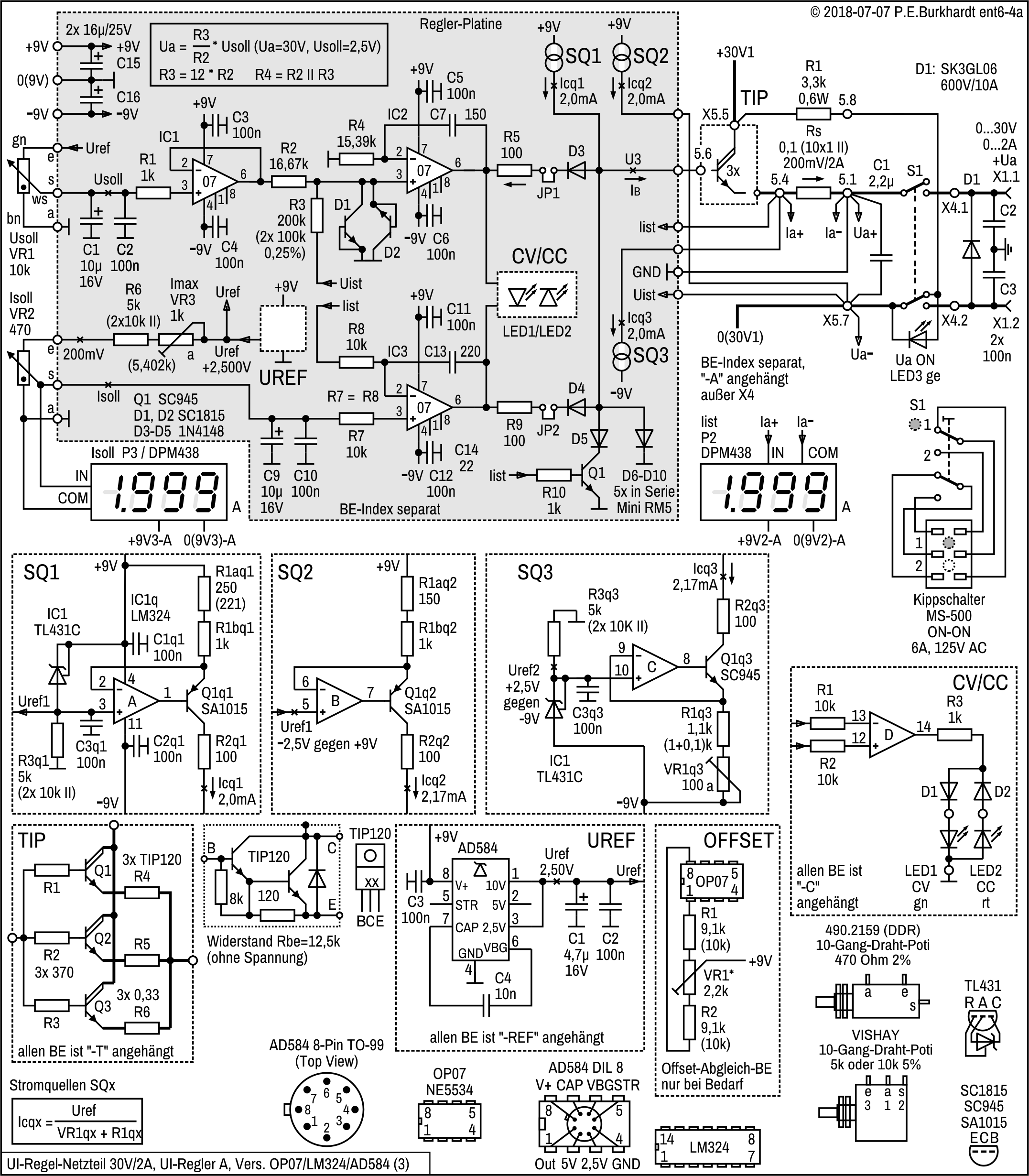 Die genannten Schaltungsteile basieren auf den weiter oben beschriebenen 723-Schaltungen (Ua einstellbar ab Null Volt).
