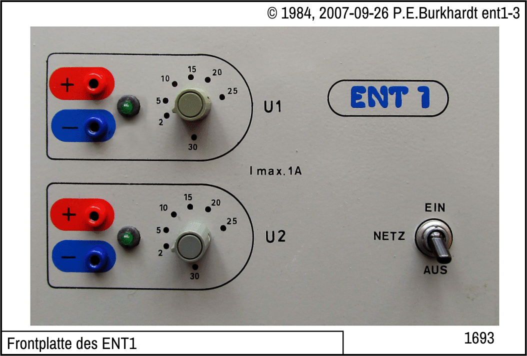 Dieses Netzteil wurde im Rahmen der "Konsumgüterfertigung" in der DDR als ENT1 für den "polytechnischen Unterricht" gefertigt. Es ist ein einfaches Labornetzteil im eigenen Gehäuse mit doppeltem Spannungsausgang und Strombegrenzung.