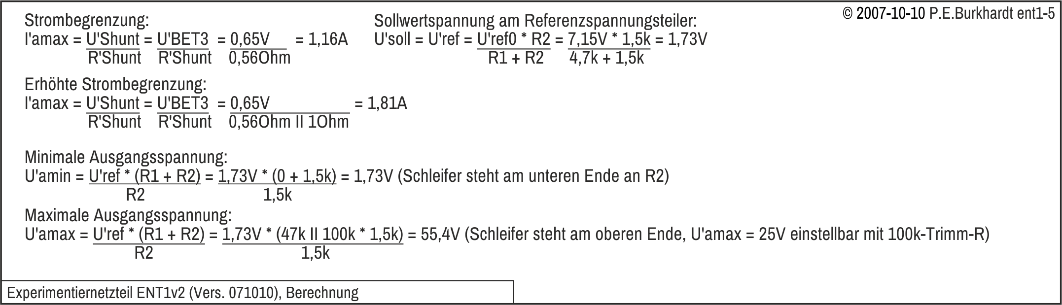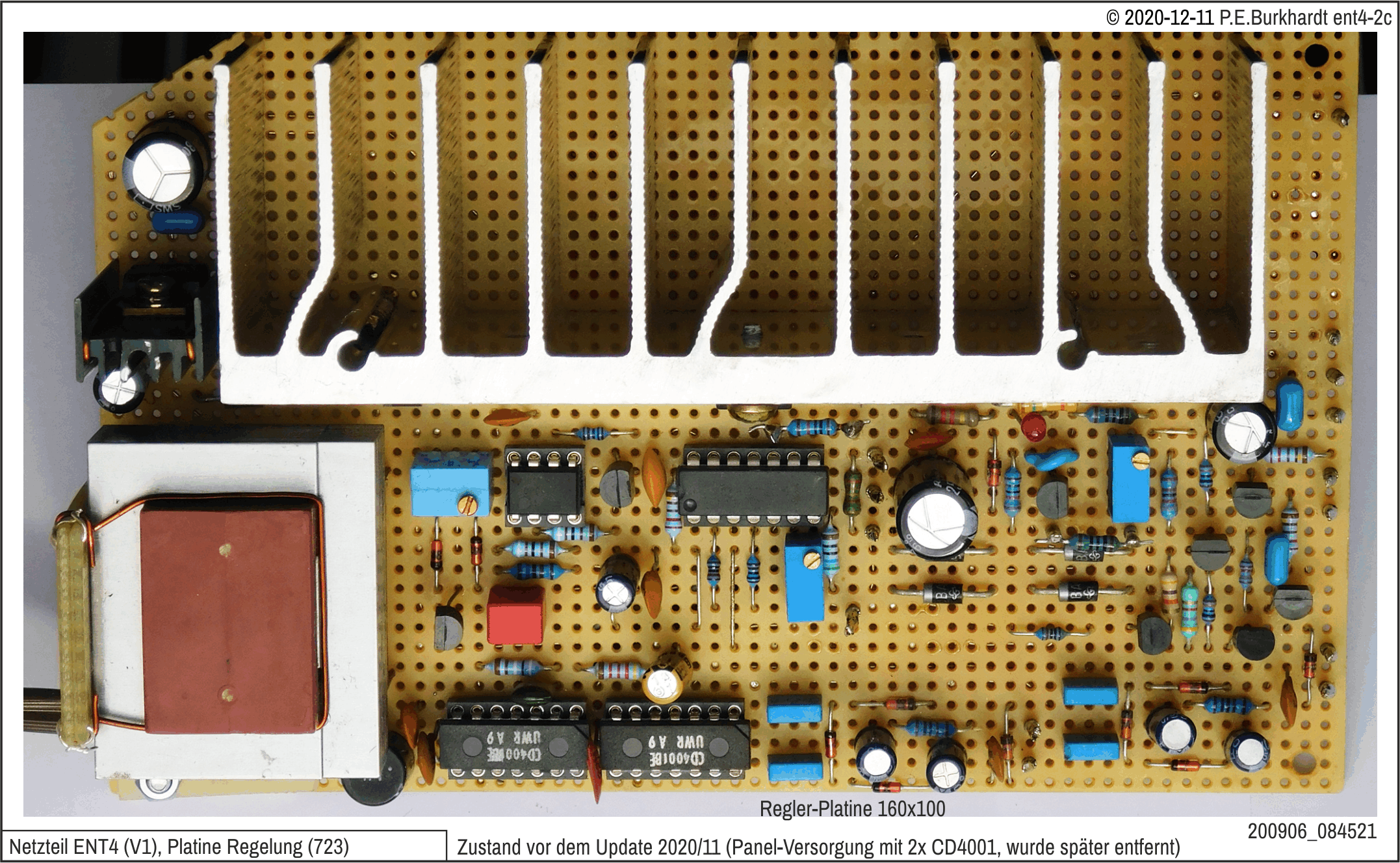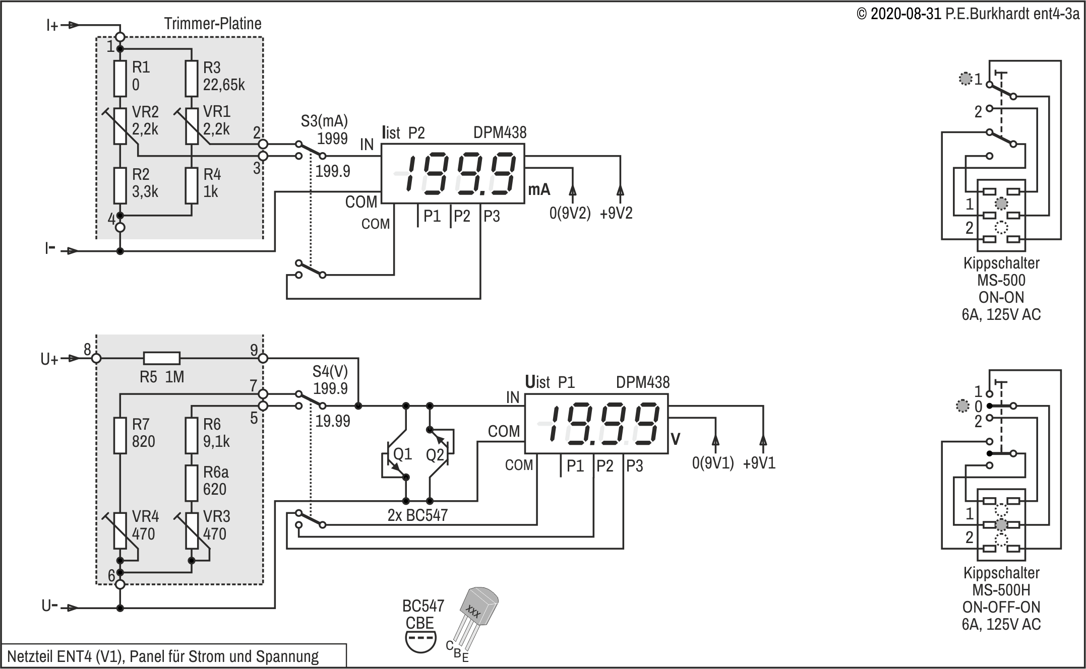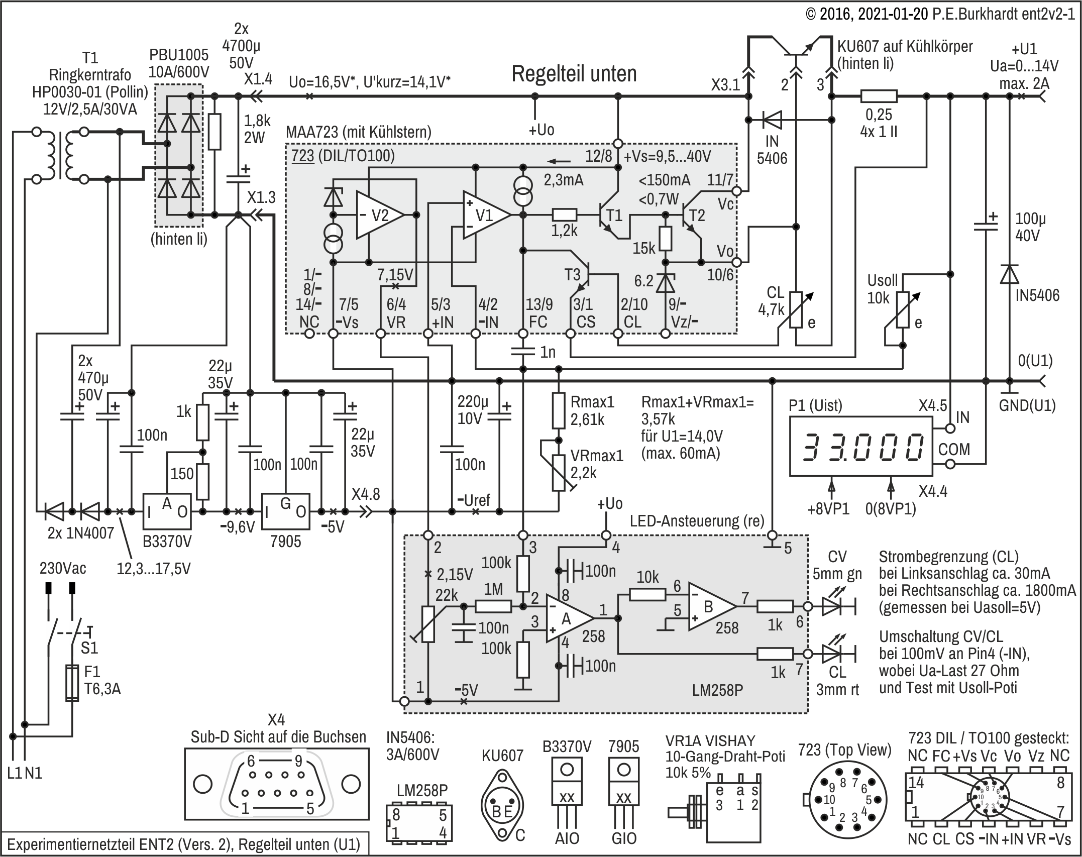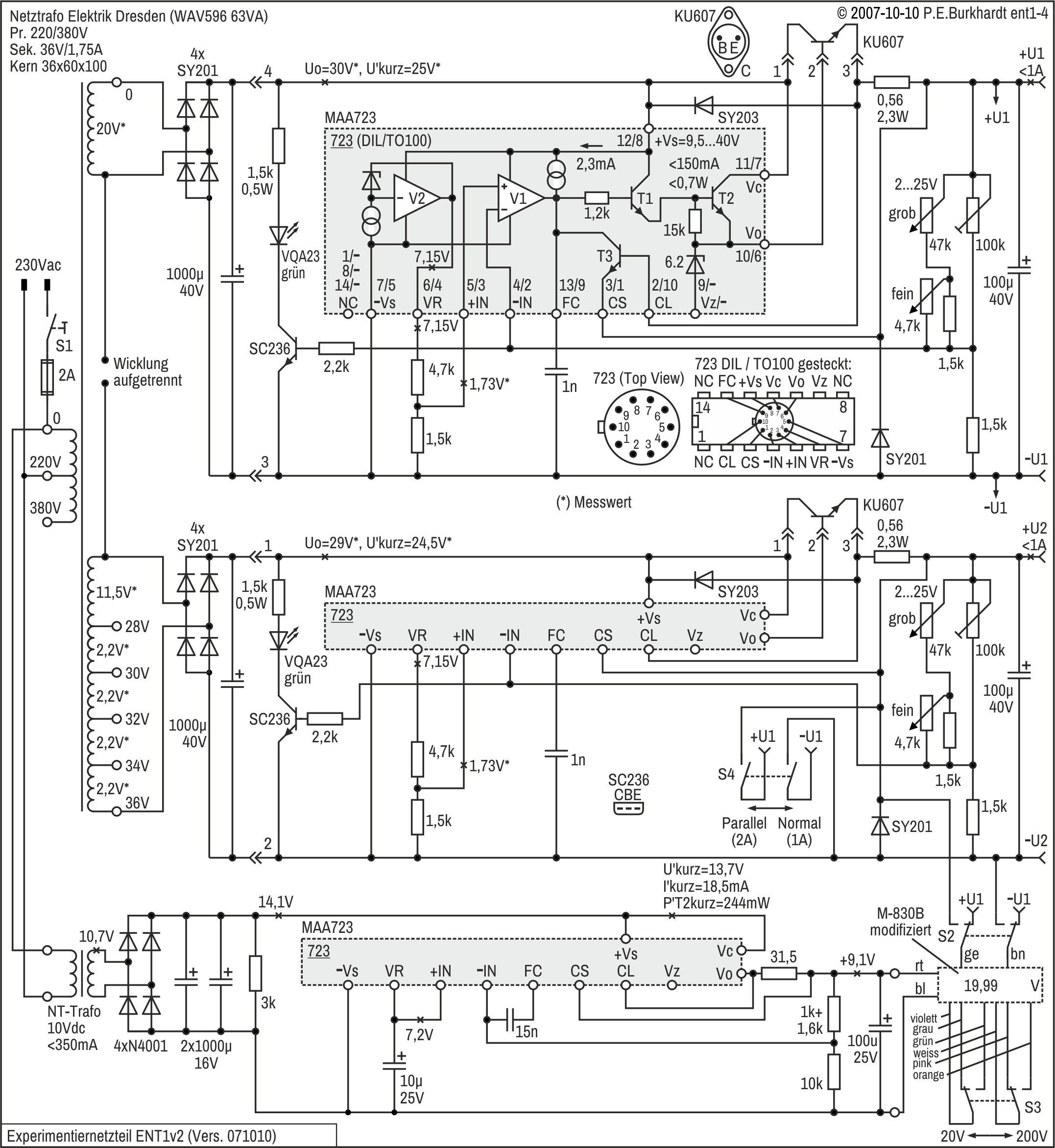 Die Schaltung enthält einige wichtige Messwerte. Die beiden Regelschaltungen einschließlich des Trafos mit Gleichrichter sind original ENT1v1. Nur die Sollspannungs-Einstellung wurde verändert (Fein-Regler).
