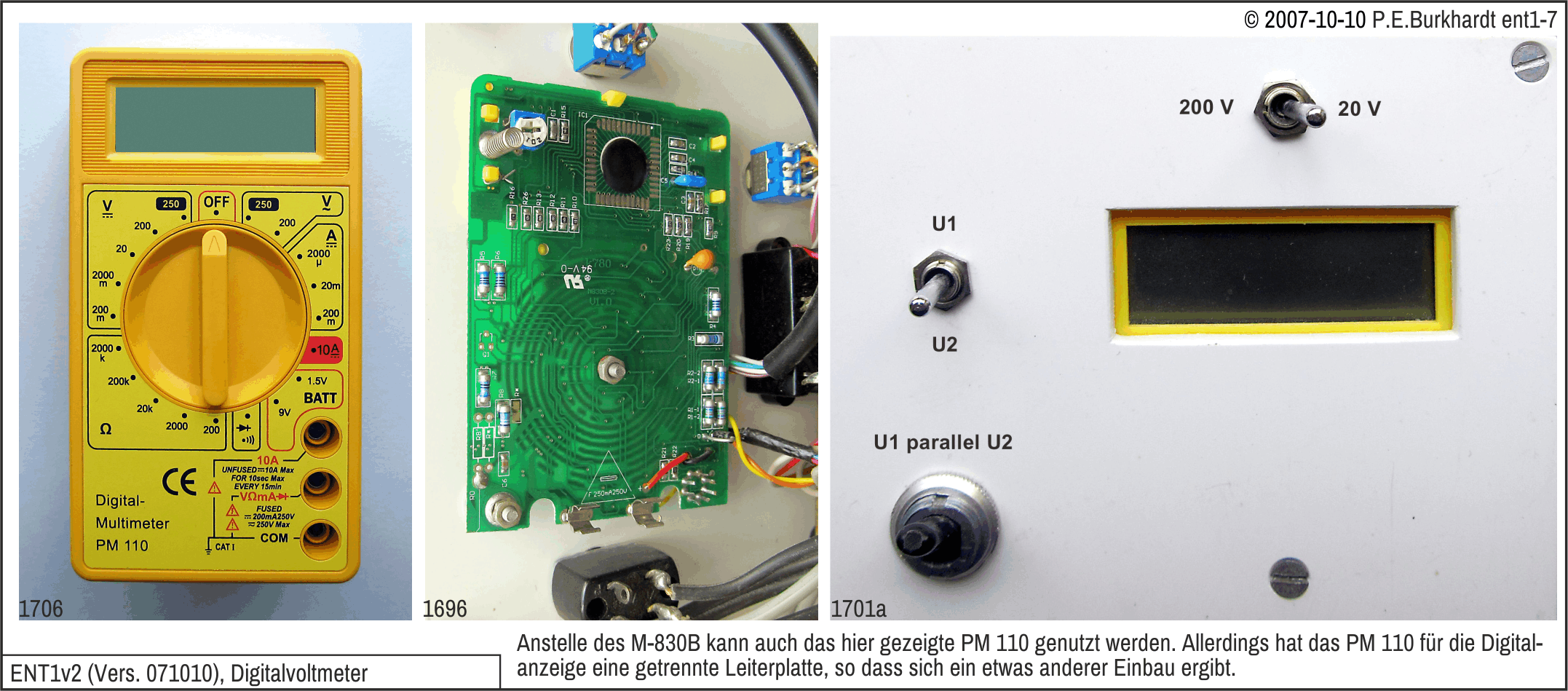 Zur Spannungsanzeige wurde die Platine des Digitalmultimeters M-830B (Billigartikel aus dem Baumarkt) verwendet. Gehäuse und Bereichsschalter entfallen, notwendig sind einige Brücken und Verbindungen zur neuen Bereichsumschaltung (Kippschalter S3) sowie zur Umschaltung auf die Ausgänge (Kippschalter S2). Im Bild sind die Änderungen/Ergänzungen dokumentiert.