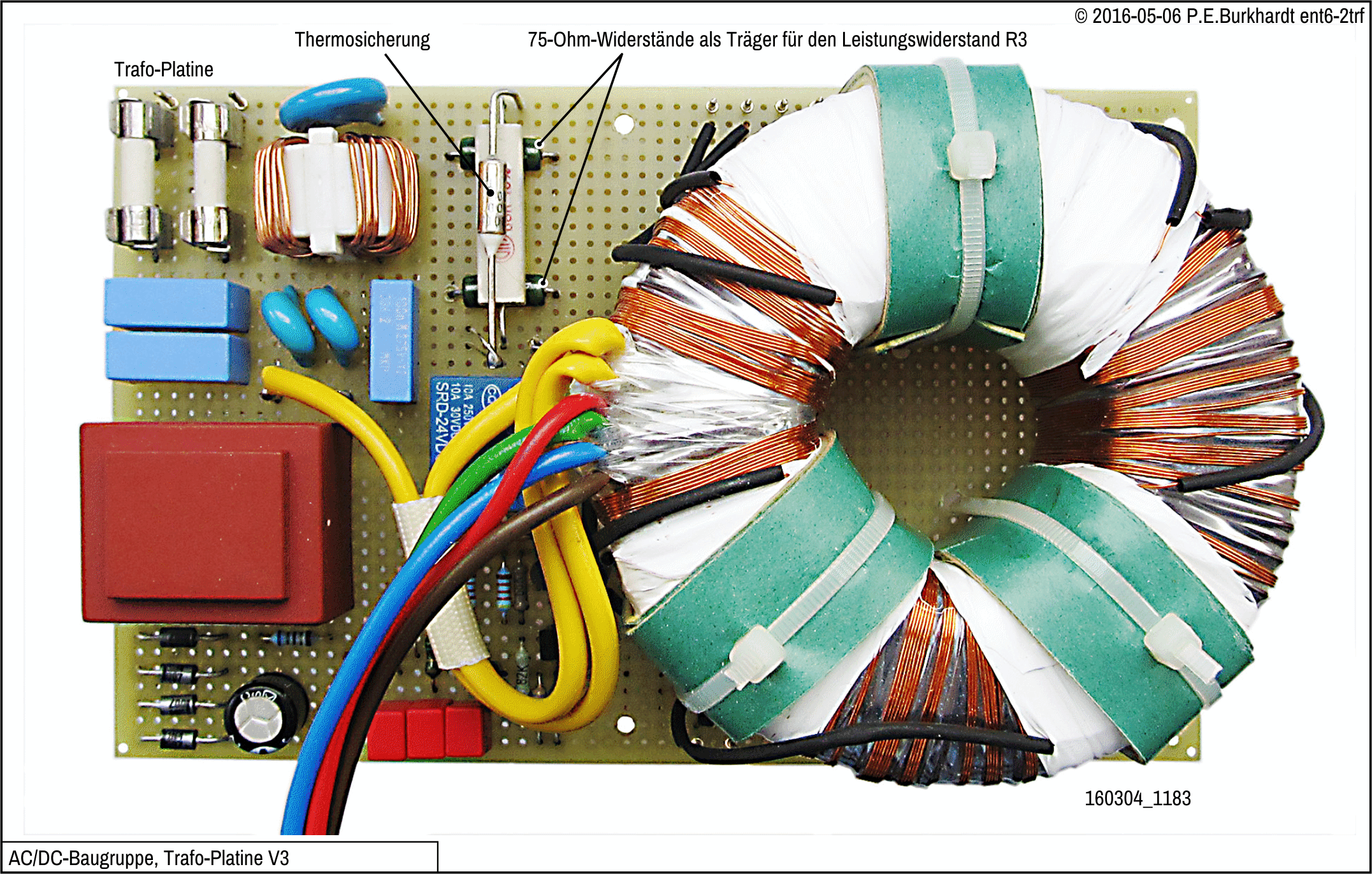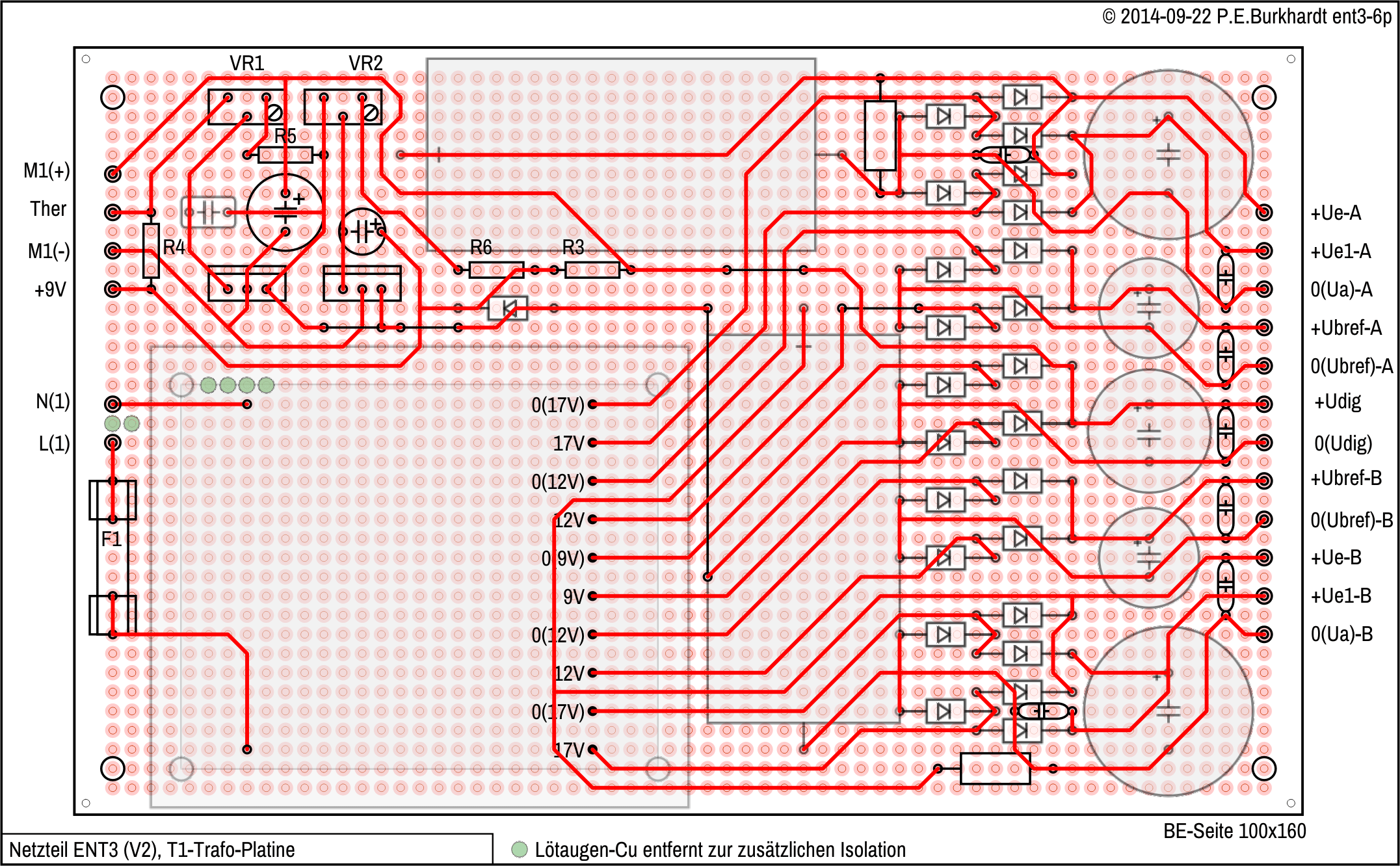 Die "Platine Rohspannung" enthält neben dem Haupt-Trafo T1 fast alle Bauelemente der Rohspannungsversorgung. Diese Platine und auch die Regler-Platine haben jeweils einen eigenen Bauelemente-Index.