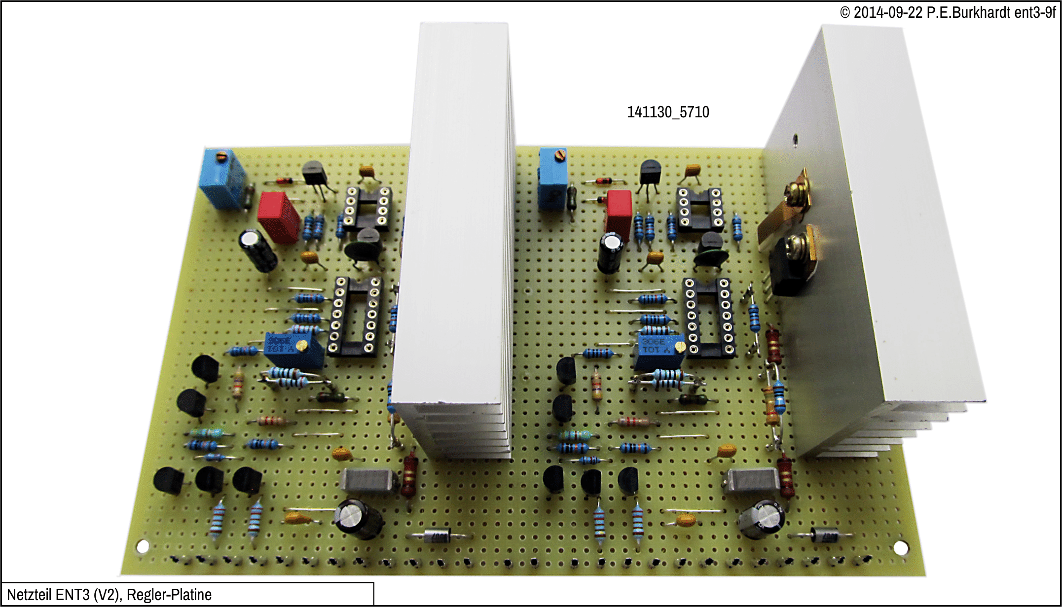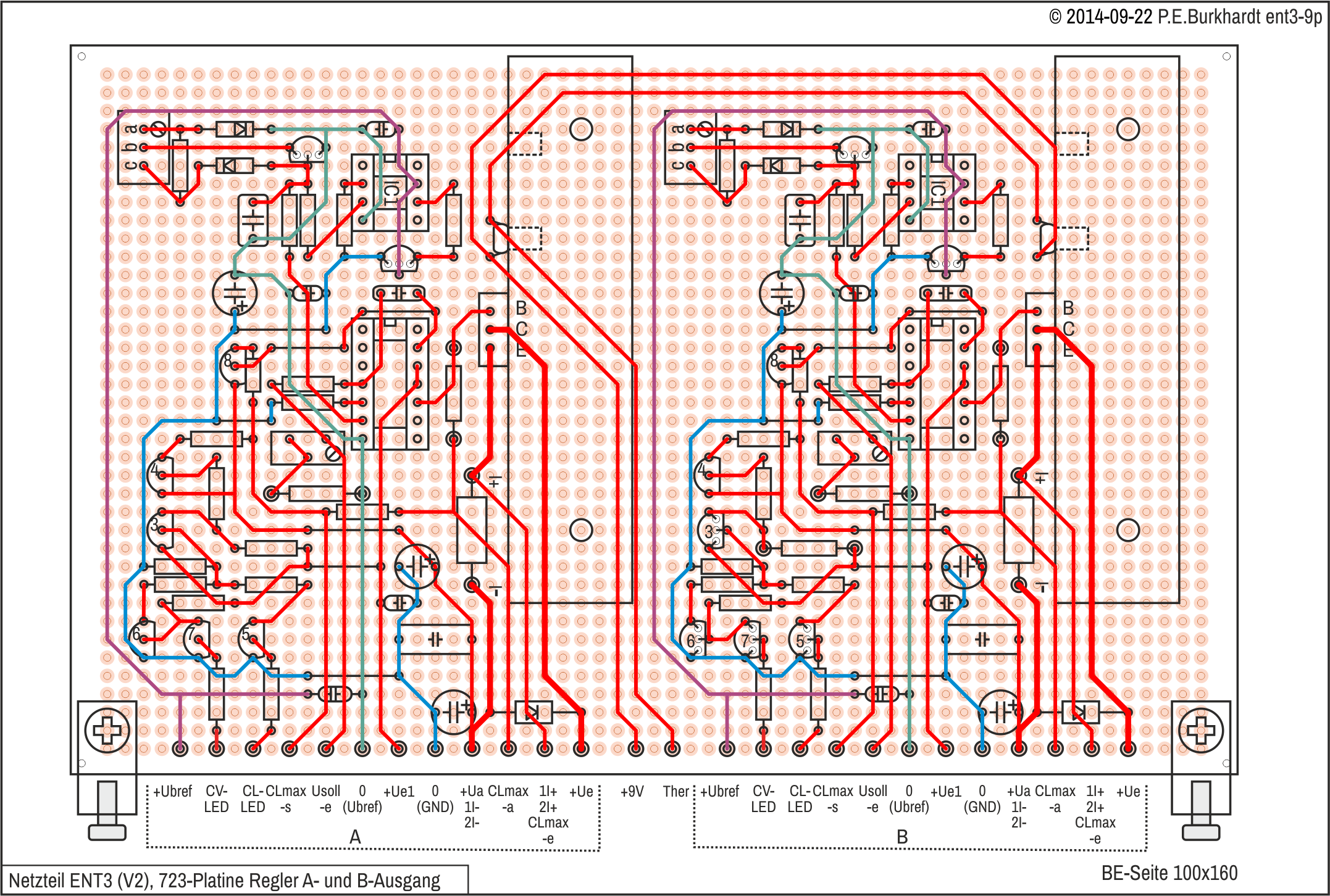 Gegenüber der vorigen ENT2-Variante ist der mögliche Laststrom von 2 A jetzt zwar doppelt so groß, dafür ist aber die Trafospannung nur etwa halb so groß. Fazit: Die mögliche maximale Verlustleistung über den Regeltransistoren KU607 ist nicht größer als vorher. Deshalb wurden die Längsregler nicht geändert.