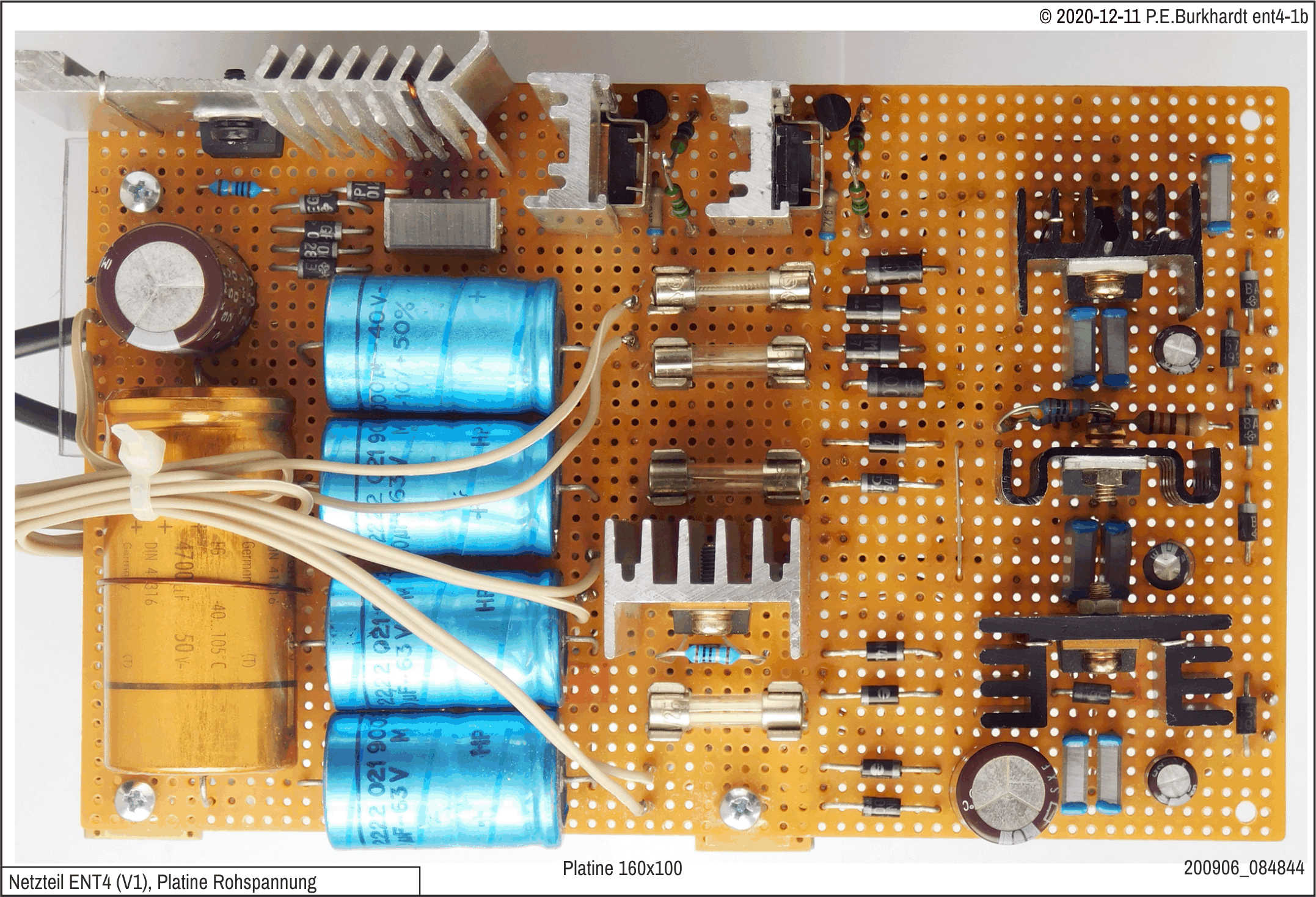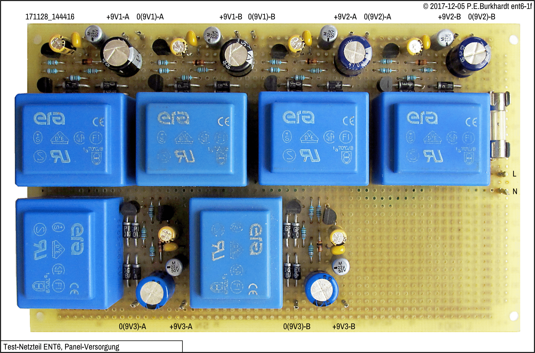 Die DC-Platine trägt die zwei Haupt-Brückengleichrichter mit Lade-Elko sowie 4 massesymmetrische Regelschaltungen mit je einem 9V-Ausgang.