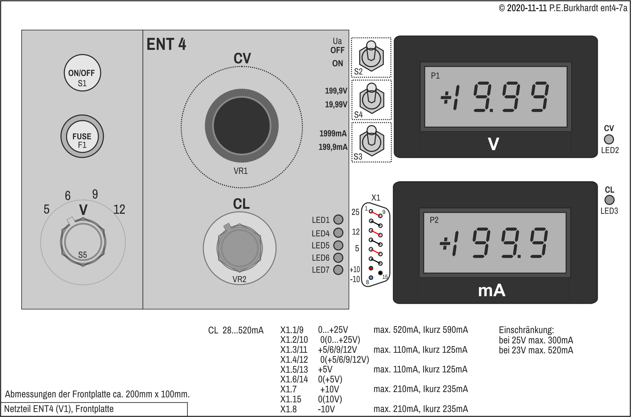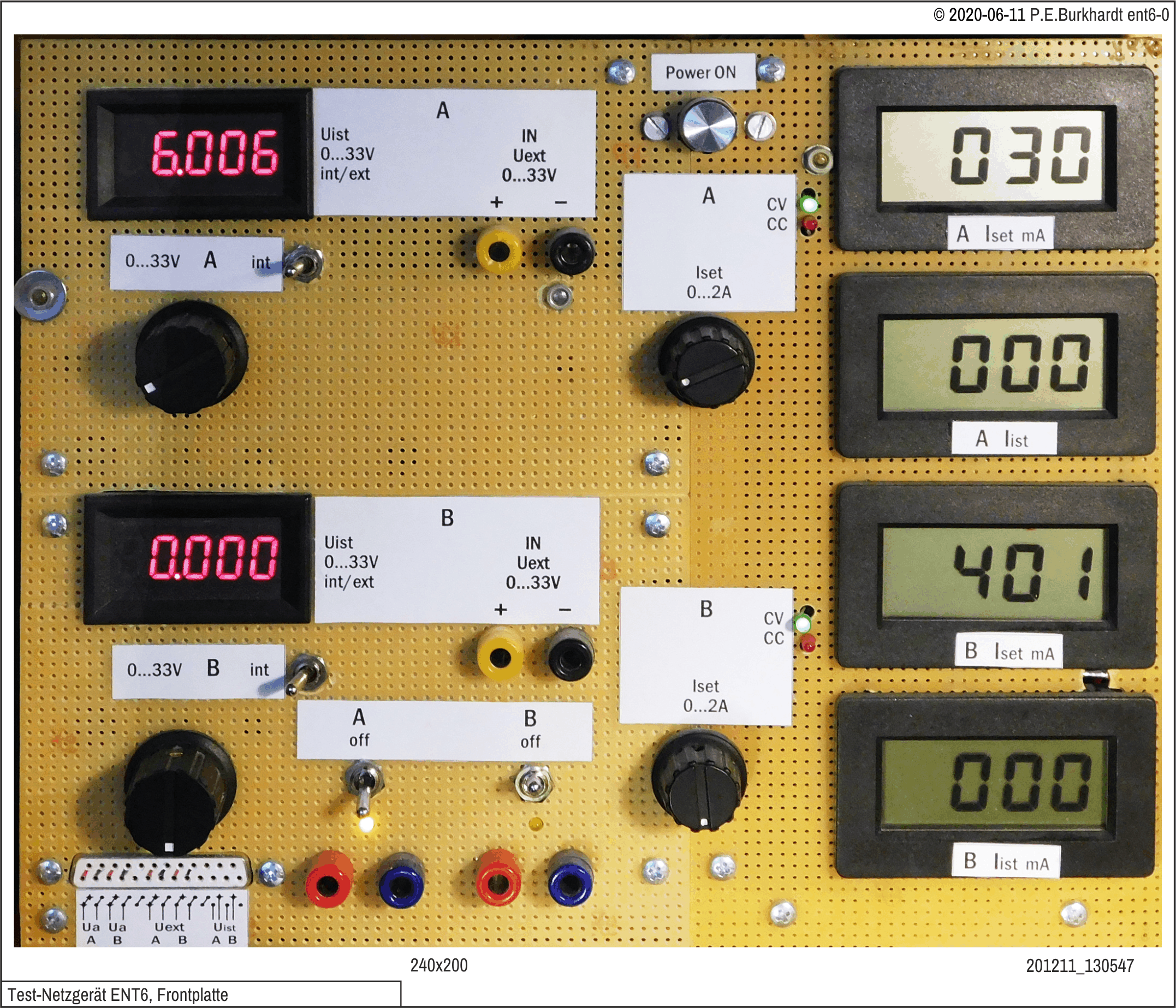 Das in 2007 schon einmal umgebaute Labor-Netzteil ENT1 hatte nach jahrelanger Nutzung wieder eine Renovierung verdient. Mit neuen Ringkerntrafos und zwei neuen digitalen Panels zur Anzeige der Ausgangsspannung hat das entstandene ENT2 folgende Eigenschaften: