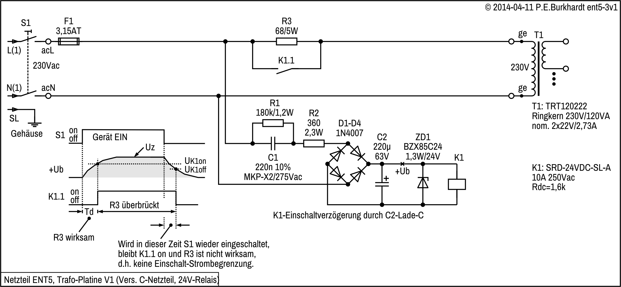Version 9 der Ringkern-Einschaltverzögerung wurde so konzipiert, dass kein zusätzlicher Trafo erforderlich ist. Relais- und Trigger-Spannung liefert ein C-Netzteil. Dadurch liegt die gesamte Schaltung der Primärseite des Ringkerntrafos T1 auf Netzpotential. Es bestehen also erhöhte Anforderungen an die Isolierung und den Berührungsschutz.