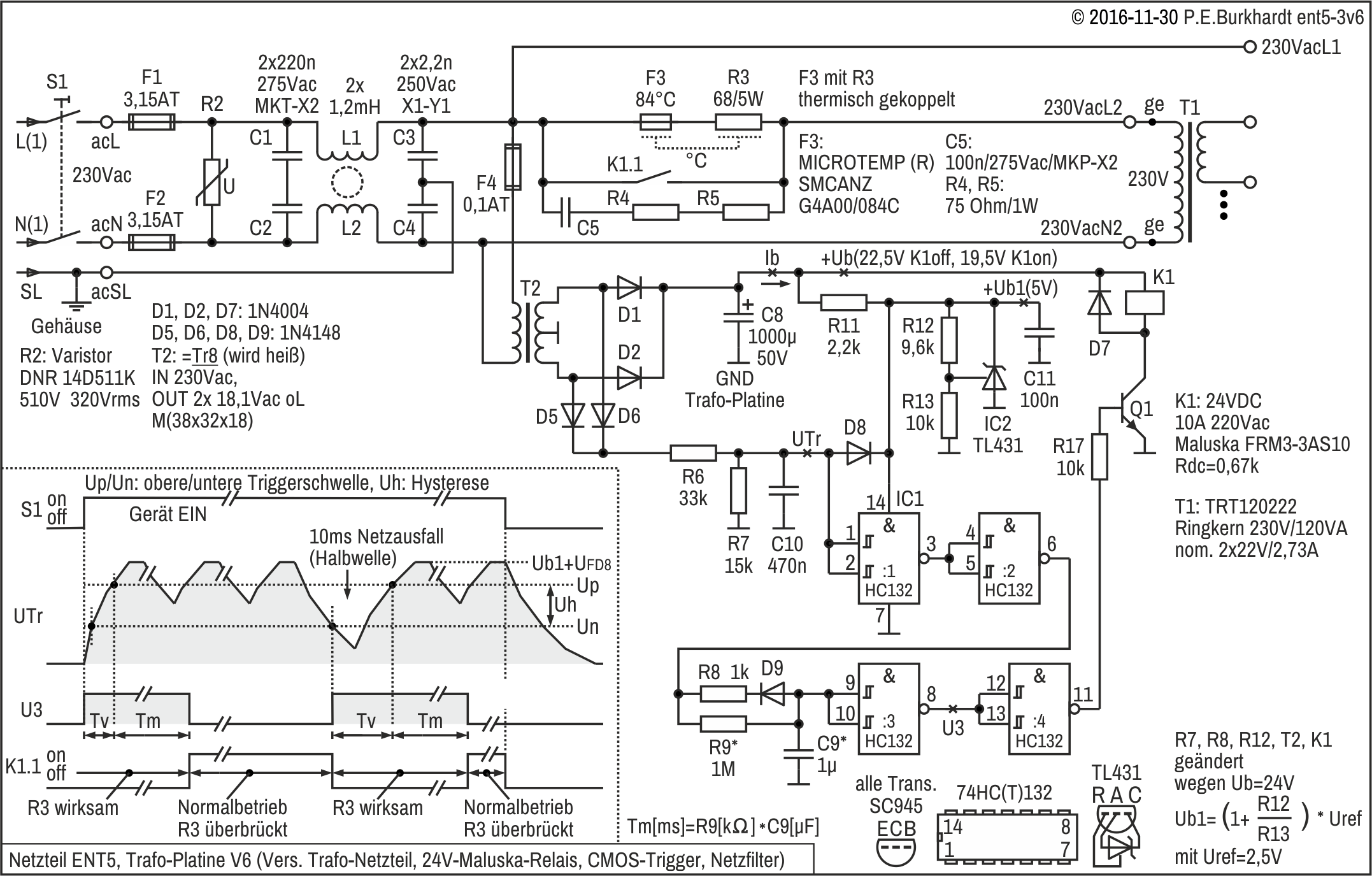 Die Schaltung der Trafo-Platine V5 ist einfach. Nur ein 4-fach-Gatter und ein Transistor sind für die retriggerbare Verzögerungsschaltung nötig. Zwar ist für die 5V-Betriebspannung der Regler TL431 zusätzlich eingesetzt, doch dieser ließe sich bei Verwendung eines Gatter-ICs mit bis 18 V Betriebsspannung (4000er Reihe) auch noch einsparen.