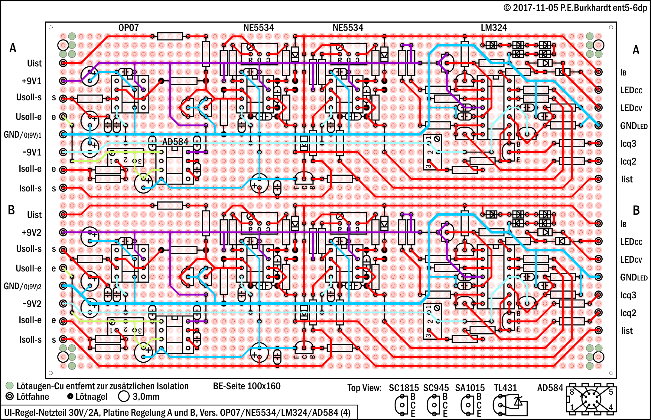 Die Platine trägt 2 gleiche UI-Regelschaltungen, und zwar für Kanal A und für Kanal B. Im Folgenden beschränke ich mich mit der Schaltungsbeschreibung auf Kanal A. Es wurden verschiedene Varianten getestet, die sich in der BE-Bestückung unterscheiden. Die verwendete Variante (3) enthält