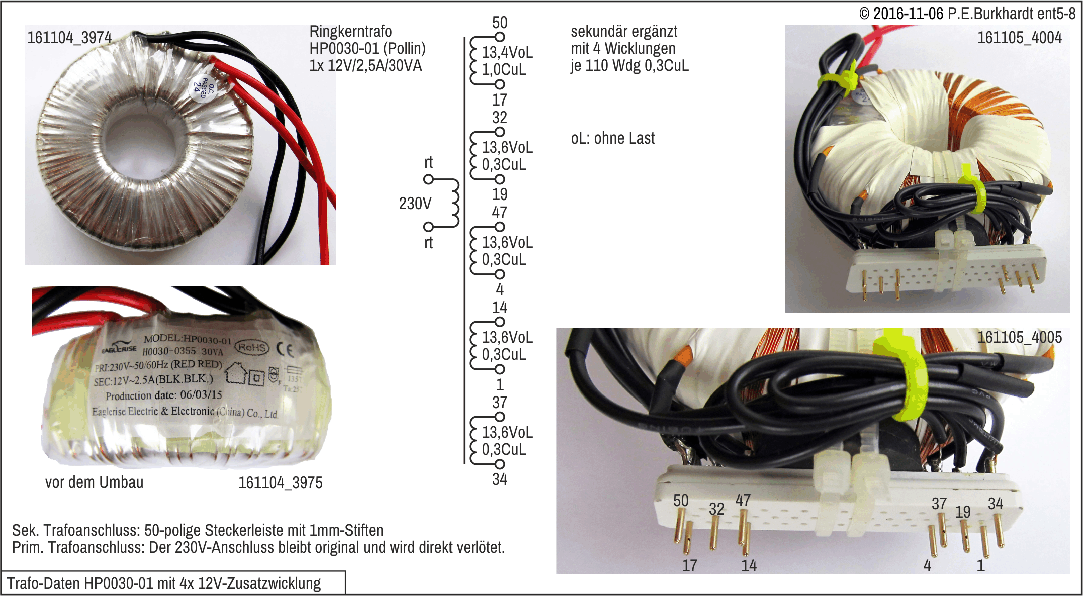 Die Ringkerntrafos haben den Vorteil, dass keinerlei Brummen zu hören ist. Außerdem ist die Eigenerwärmung im Leerlauf minimal. Zudem sind sie relativ klein, so dass beide Trafos in das alte ENT1-Gehäuse passen.
