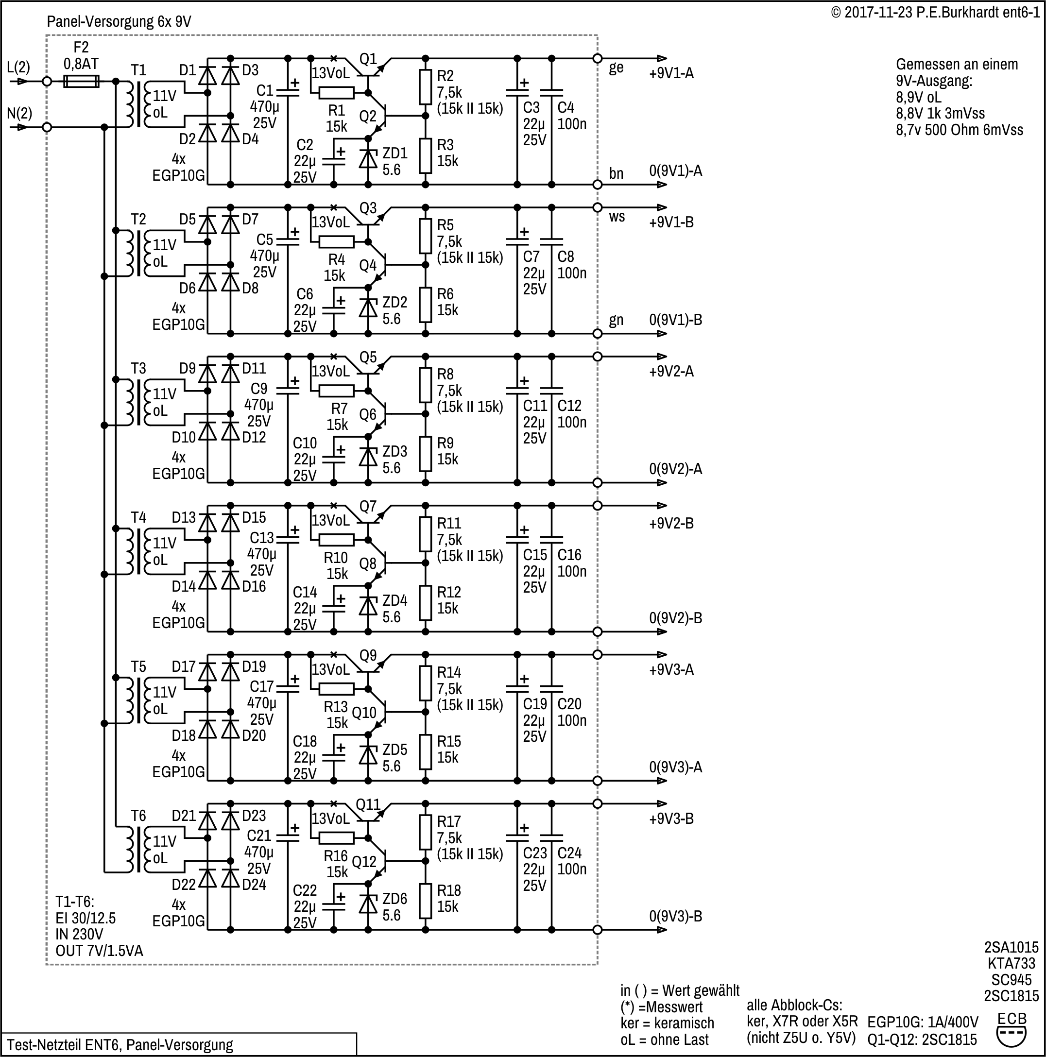 Die Panel-Platine ist mit 6 identischen 1,5VA-Trafos bestückt, die jeweils 11 Vac (ohne Last) liefern. Die 6 Regelschaltungen sind völlig gleich aufgebaut und nach altem Muster mit Transistoren realisiert. Die Verwendung gleicher Widerstände hat Vorteile bei Materialbeschaffung und Bestückung.