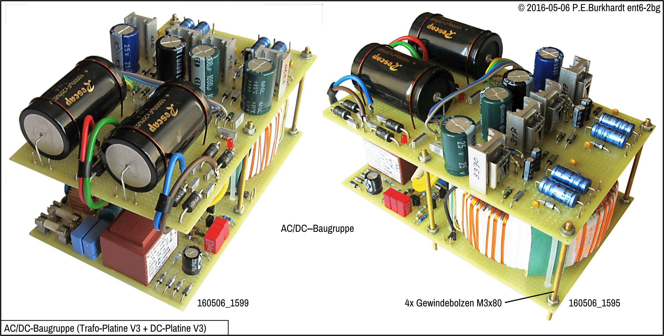 DC-Platine und Trafo-Platine haben gleiche Abmessungen und Befestigungsbohrungen für die 3mm-Abstandsbolzen. Die Gewindebolzen verbinden beide Platinen und dienen gleichzeitig der Befestigung der ganzen Baugruppe. Da der Ringkerntrafo schwer ist, wurden die Bolzen symmetrisch zum Trafo angeordnet.