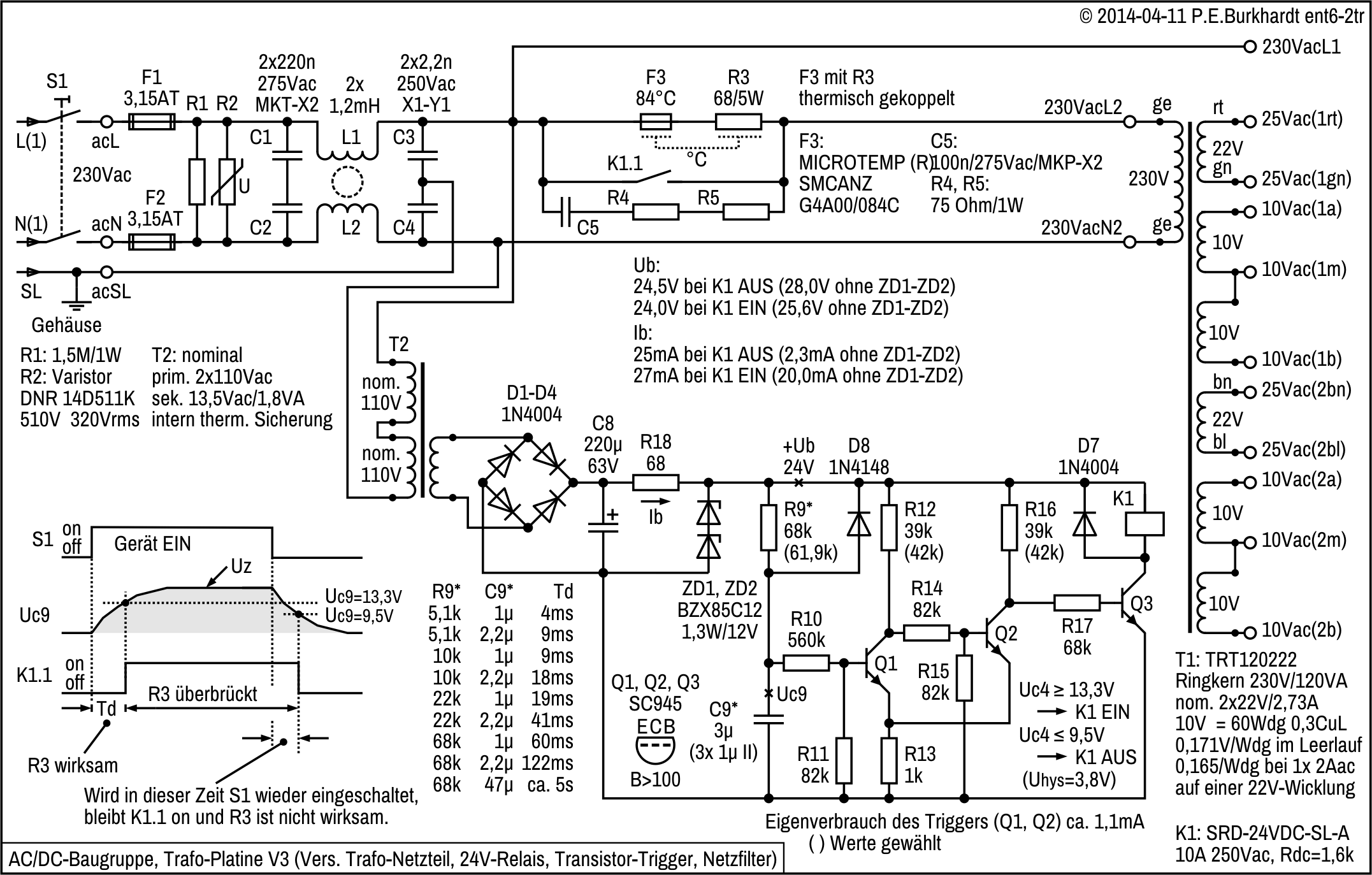 Die T2-Sicherung F4 wurde vorgesehen, da T2 offensichtlich keine interne thermische Sicherung besitzt. Für das Relais wird direkt die Spannung über dem Lade-Elko C8 benutzt, ohne weitere Siebung oder Stabilisierung.