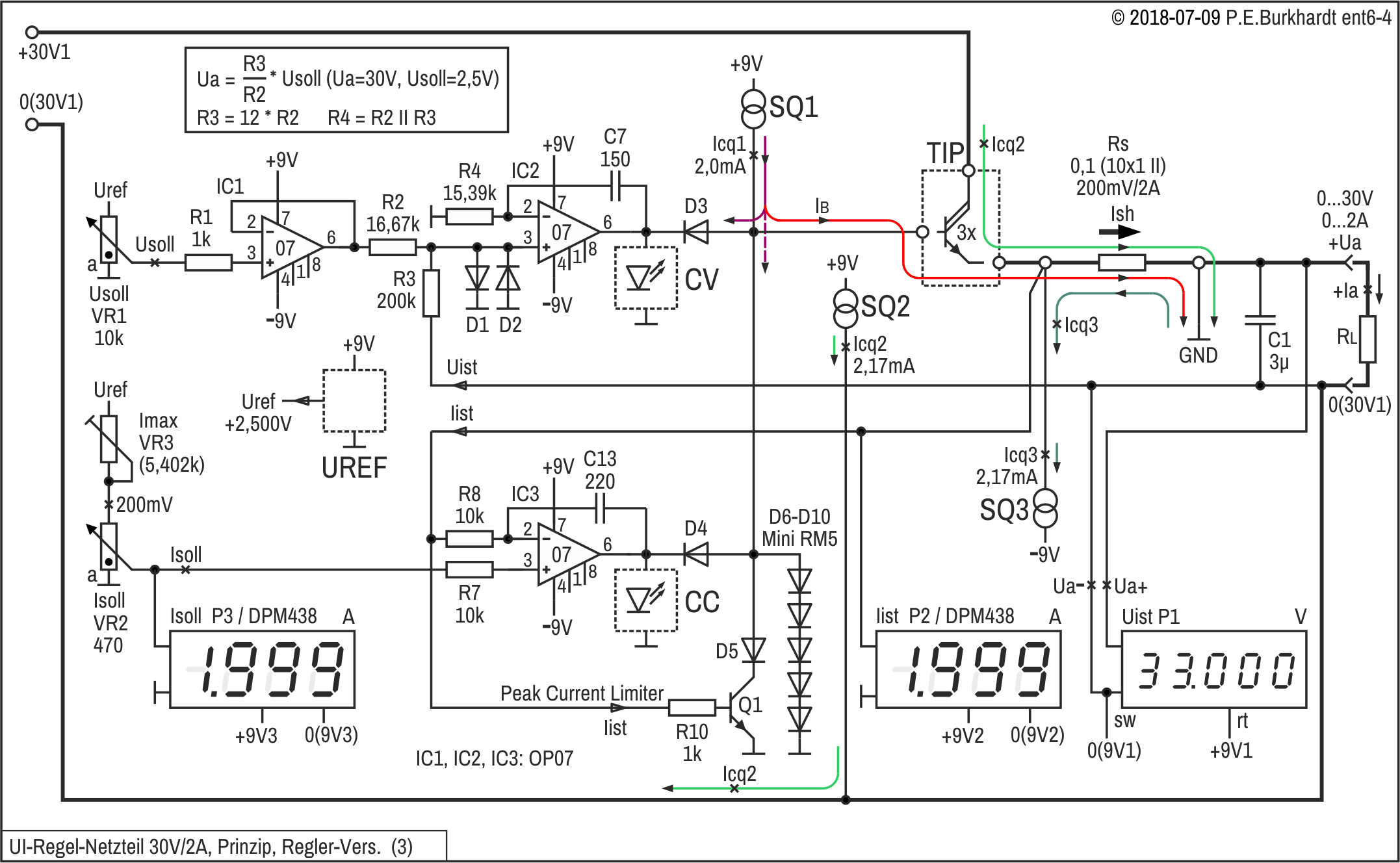 Die Masseleitung 0(30V1) führt vom Lade-C der Rohstromquelle (im Bild nicht gezeichnet) durchgängig bis zum Minus-Anschluss 0(30V1) der Ausgangsspannung +Ua. Die für den CC-Betrieb nötige Stromistwert-Erfassung erfolgt wie üblich über einen Shunt (Widerstand) und ist in der Plus-Leitung nach dem Transisor-Längsregler (TIP) angeordnet.