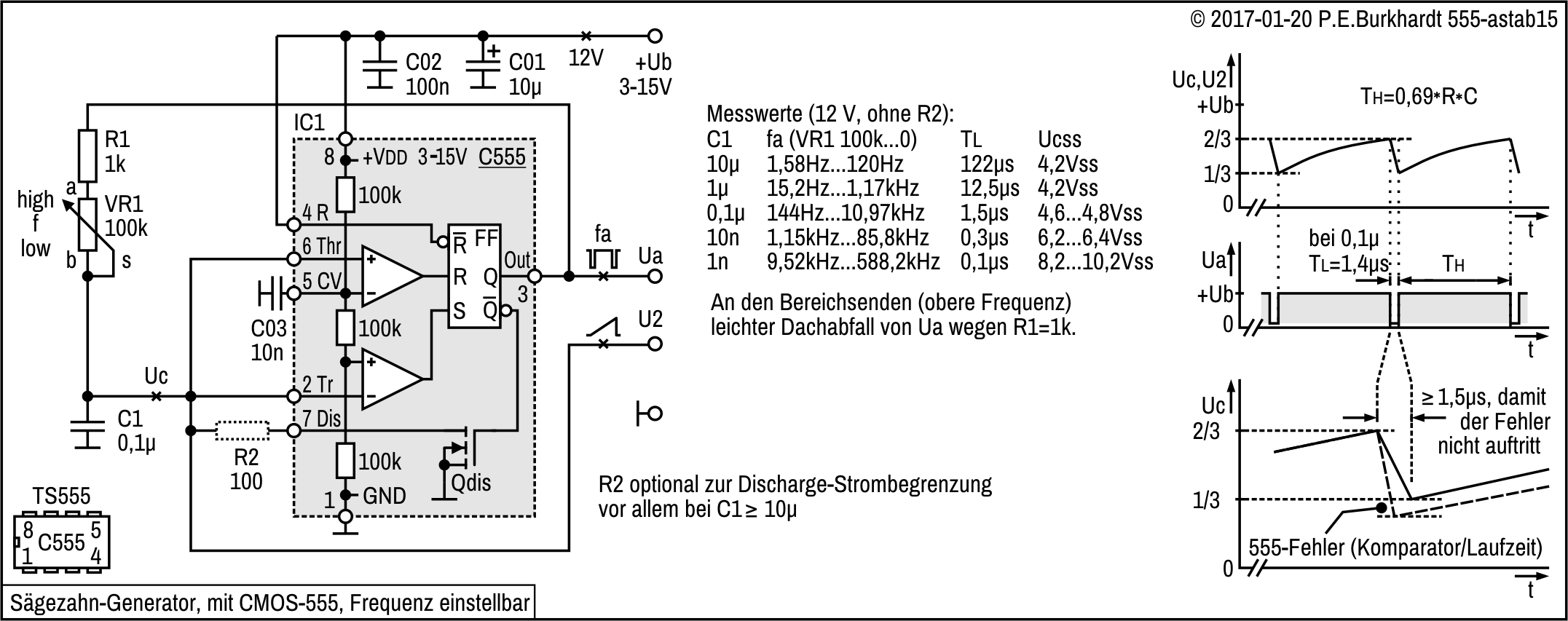 Mit und ohne Pin5-Beschaltung ist ein Kondensator 10 bis 100 nF von Pin 5 nach GND vorzusehen, um Störeinflüsse auf den 555 zu vermeiden. Bei dynamischer CV-Ansteuerung entfällt dieser Kondensator.