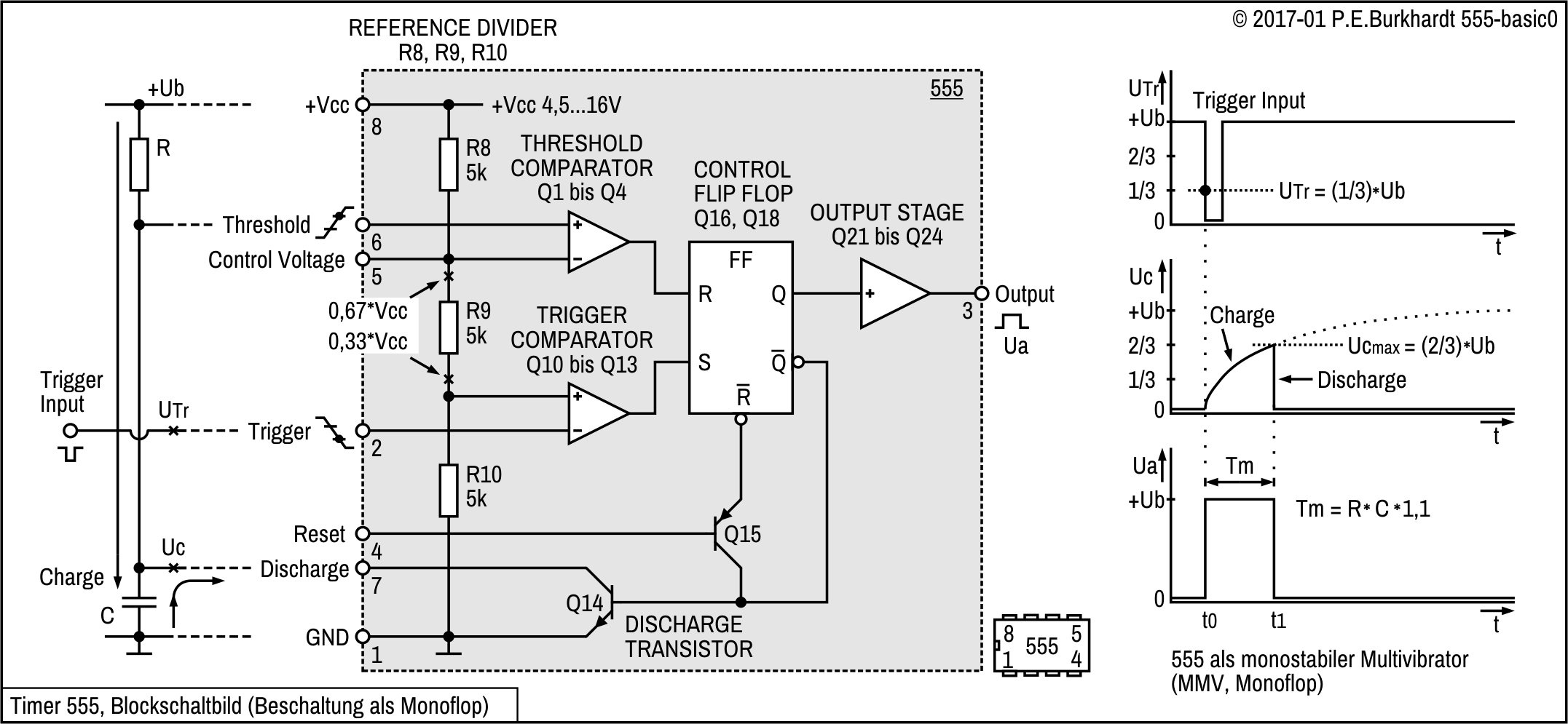 Die 2 Schwellwertschalter und das Flip Flop bilden zusammen mit dem Referenz-Spannungsteiler einen Fensterkomparator für den Bereich 1/3 bis 2/3 der Betriebsspannung. Damit der 555 in seiner ersten Hauptanwendung als Zeitgeber (Timer, Monoflop) arbeiten kann, sind extern mindestens ein Widerstand R und ein Kondensator C erforderlich. Im Zusammenspiel mit der C-Aufladung über R und der C-Entladung über den Entladetransistor Q14 entsteht ein Ausgangsimpuls, dessen Länge Tm von der RC-Zeitkonstante abhängt. Gestartet wird der ganze Vorgang mit einem Triggerimpuls (Trigger Input).