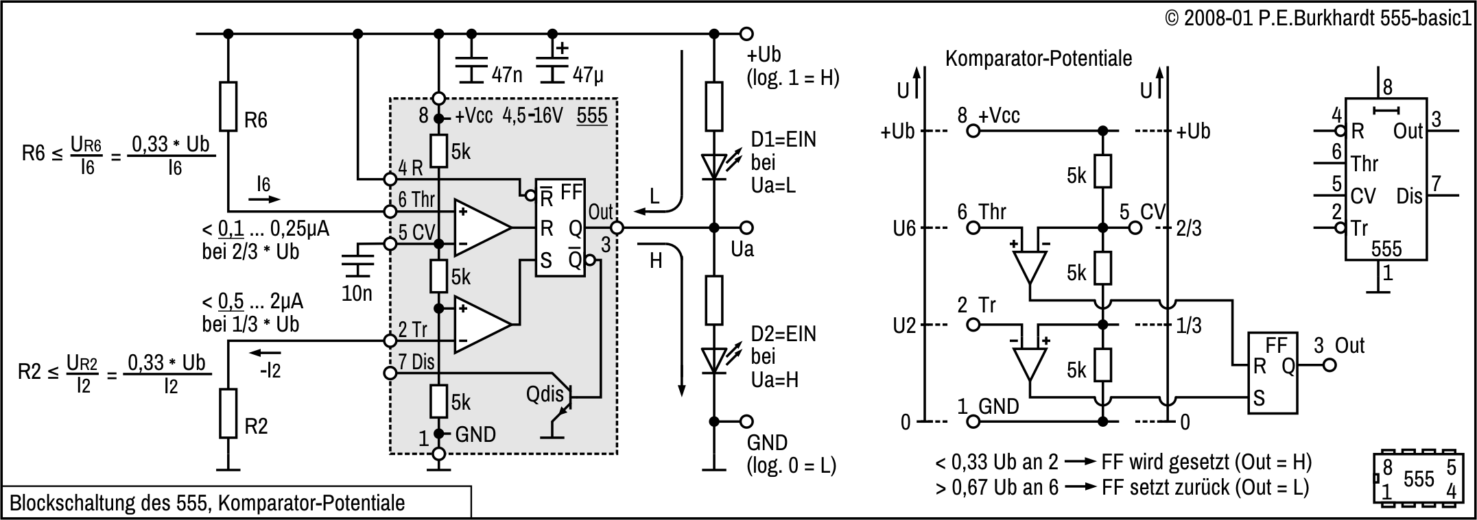 Ohne Pin5-Beschaltung bestimmt der interne Spannungsteiler 3x 5 kΩ die Referenzspannungen 1/3 und 2/3 von Ub für Trigger- und Threshold-Komparator. Die Threshold-Referenz lässt sich am Pin 5 messen.
