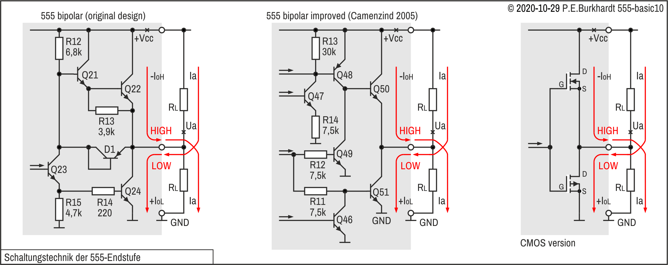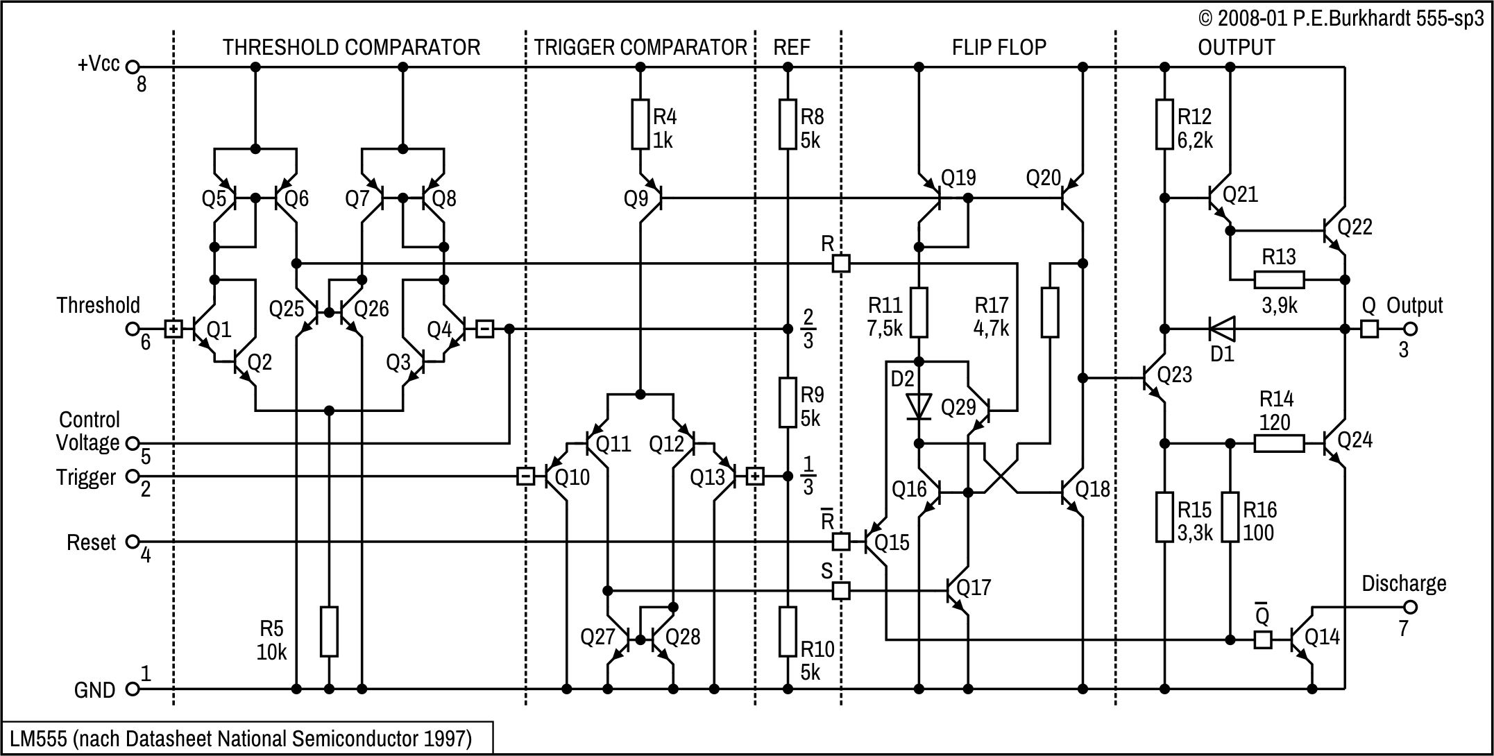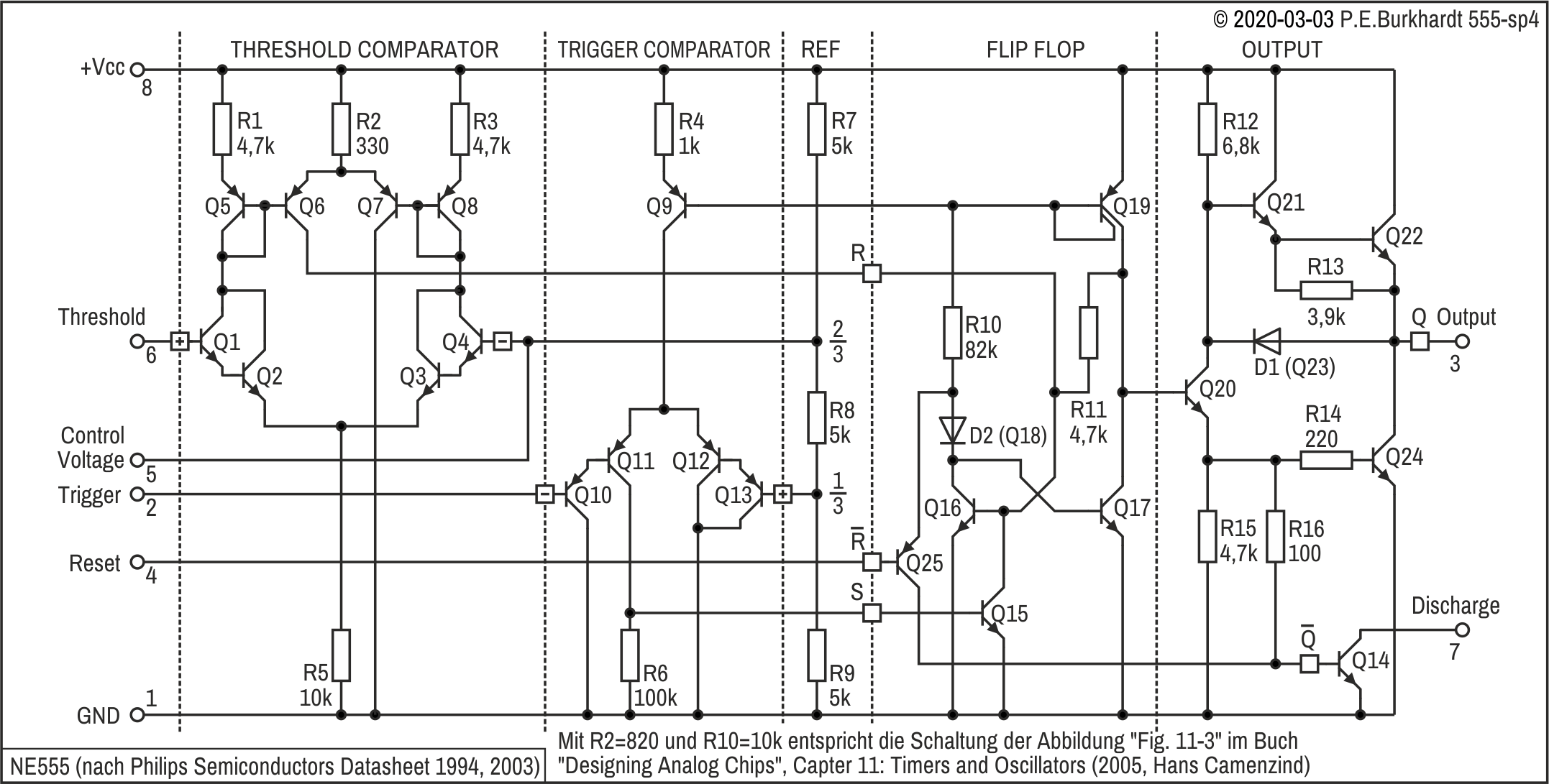 Vorangestellt sei die Original-Schaltung des von Hans R. Camenzind im Oktober des Jahres 1971 entwickelten 555-Timers. Der 555 wird noch heute (in 2020) in ähnlicher Schaltung produziert, allerdings mit viel kleineren Strukturen und zum Teil geänderten Widerstandswerten.