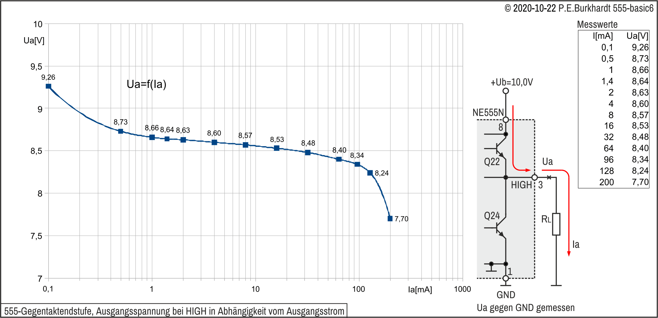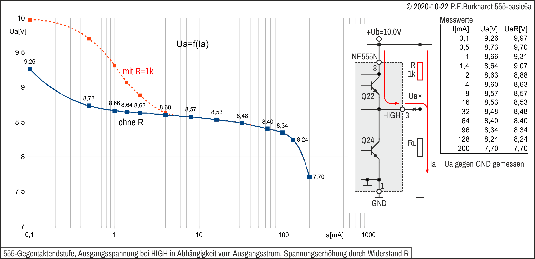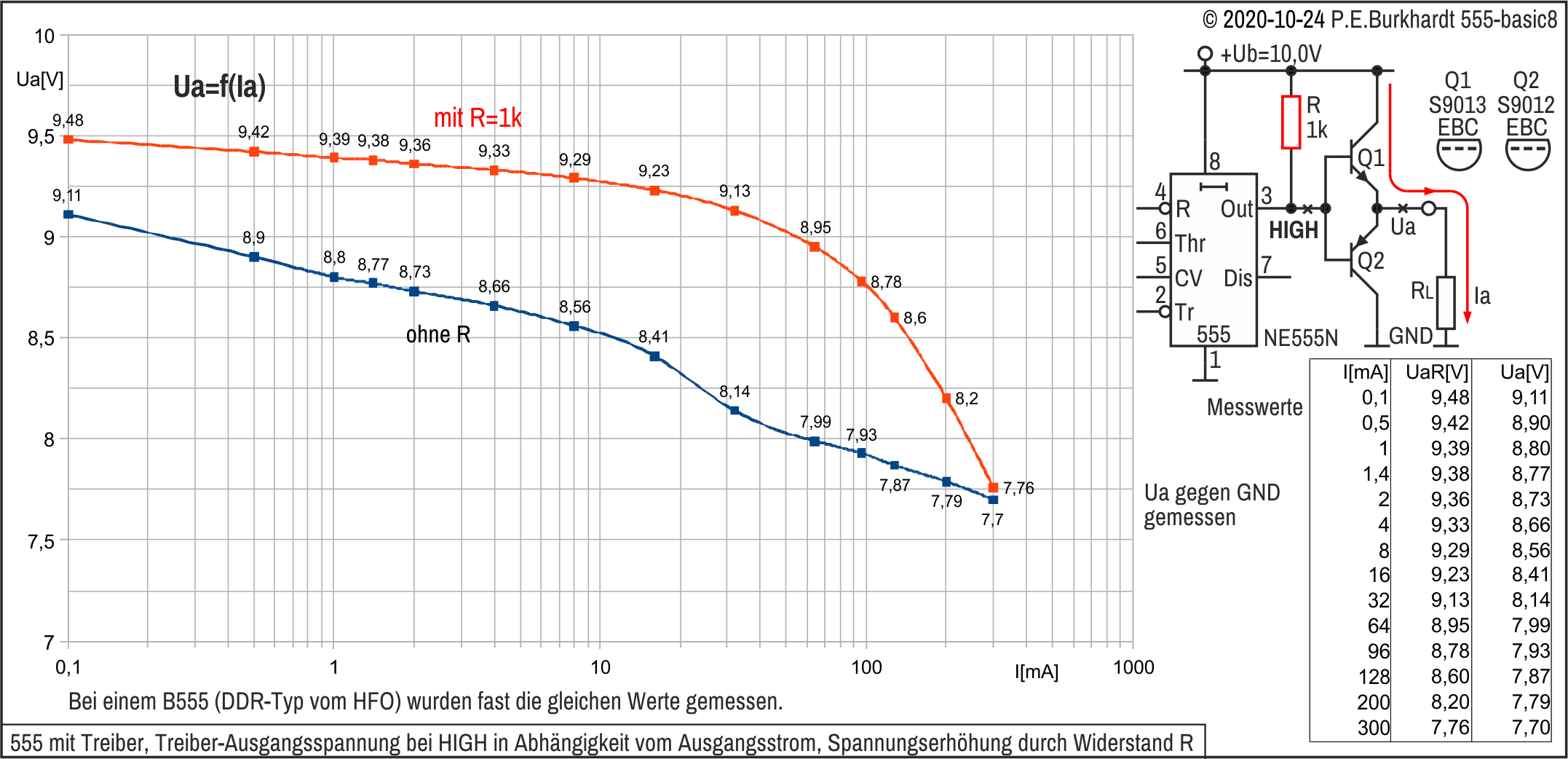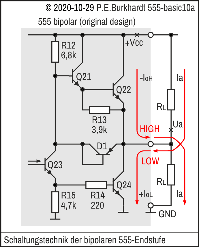 Allerdings ist das mit hohen Restspannungen (gleichbedeutend mit hoher Verlustleistung) verbunden. Bei 200 mA fallen über Q22 (oberer Zweig) bzw. über Q24 (unterer Zweig) bis zu 2,5 V ab (typisch lt. Datenblatt). Das sind bereits 500 mW. Lange hält das kein 555 aus, die maximale Verlustleistung im DIL-8 beträgt 600 mW.