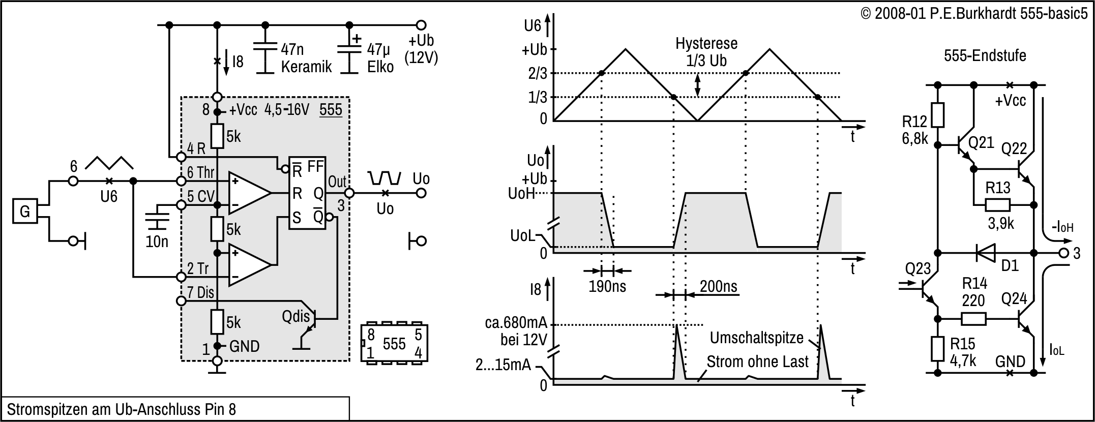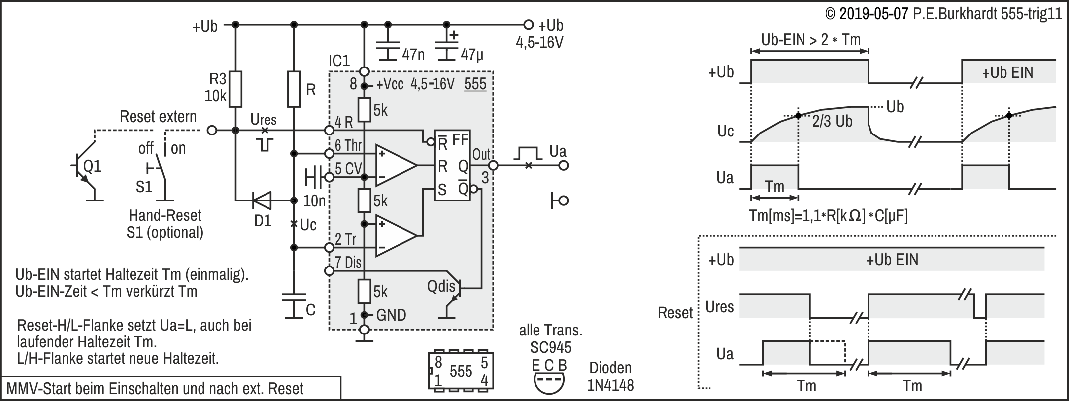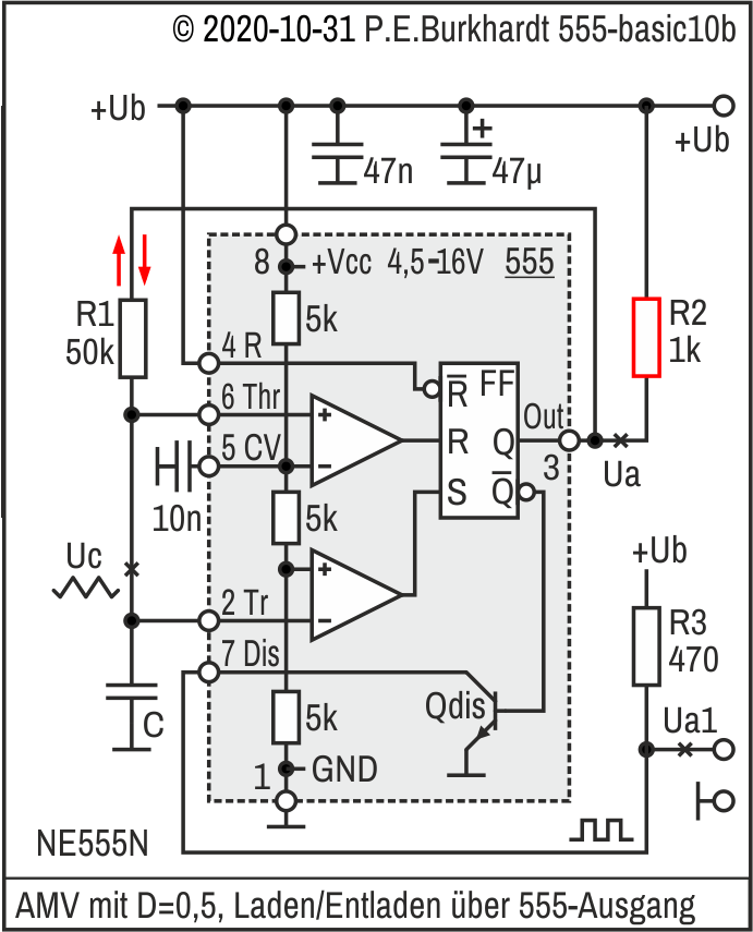 Vorteilhaft sind die hohe Belastbarkeit der Ausgänge und der große 555-Ub-Bereich. Durch Verwendung des Entlade-Transistors Qdis für die Kreuzkopplung sind keine Rückwirkungen auf Q bzw. /Q zu befürchten.
