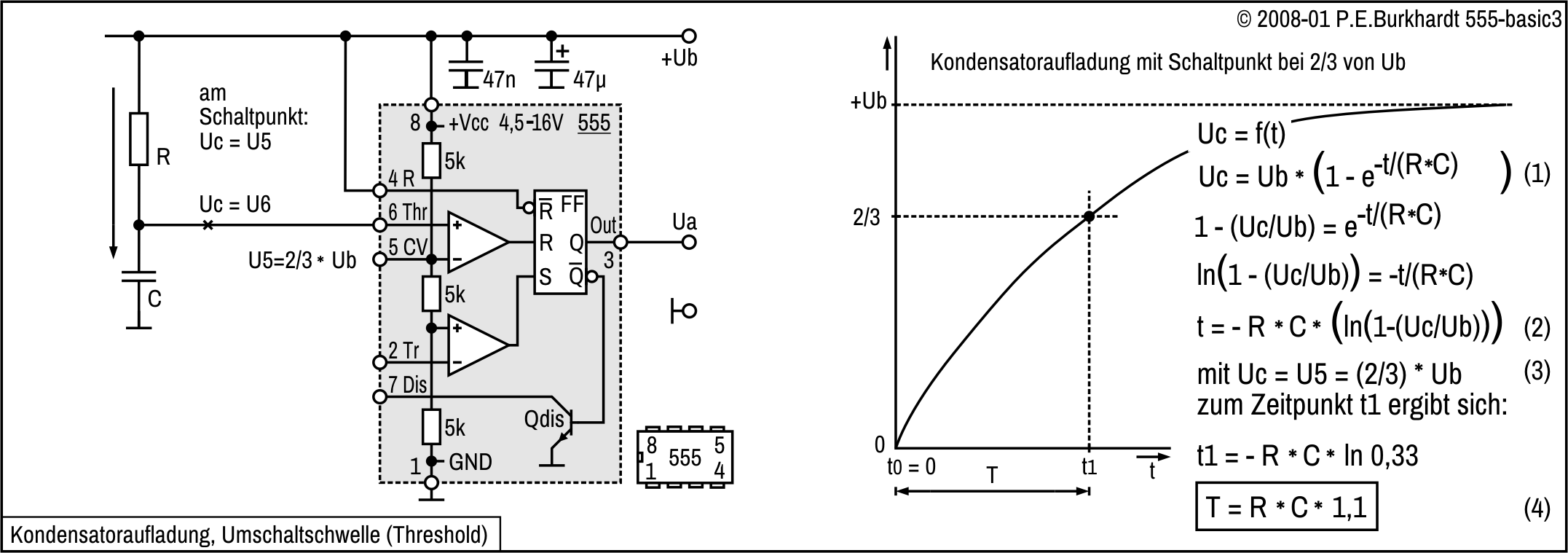 Bleibt nur noch der Threshold-Eingang Pin 6. Aber auch der Threshold-Komparator liefert kein Rücksetzsignal an R des internen FFs, da sein (+)-Eingang an GND liegt. Die Spannung am (+)-Eingang des Threshold-Komparators muss aber größer sein als 2/3 von Ub, um das interne FF über R rücksetzen zu können.