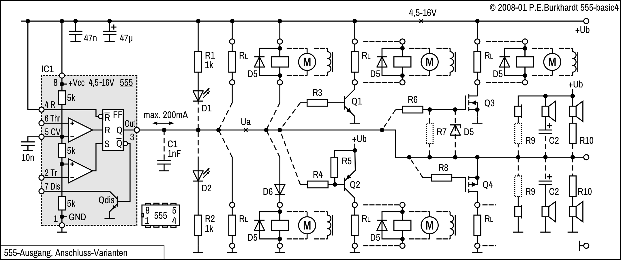 Hier steht neben der Funktion die prinzipielle Schaltungstechnik mit dem bipolaren Timer xx555 im Vordergrund. Weitere praktische 555-Schaltungen sind über die obigen Links erreichbar. In einigen Schaltungen wird die 555-CMOS-Version verwendet, die manchmal Vorteile bringt (höhere Grenzfrequenz, hochohmige Eingänge, geringerer Betriebsstrom u.a.).