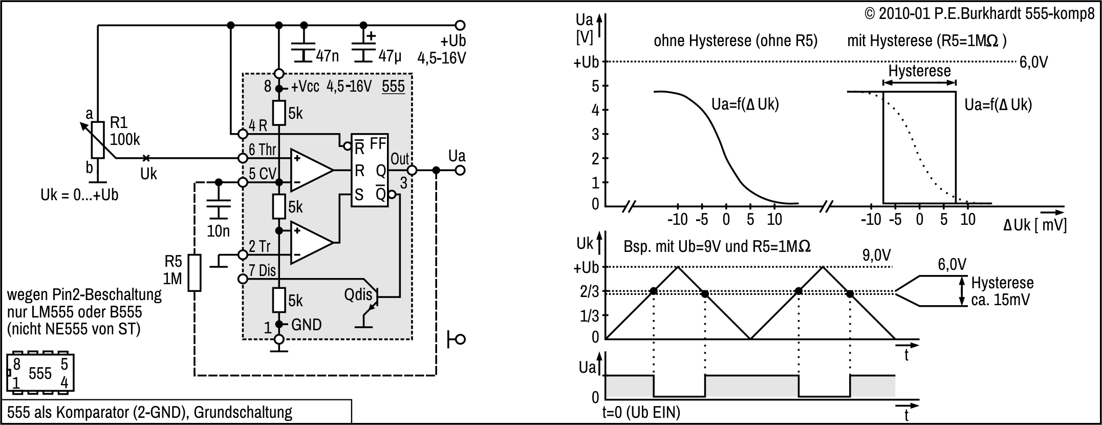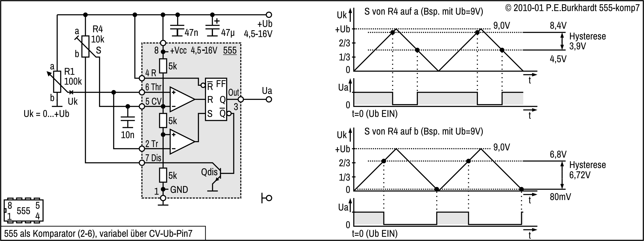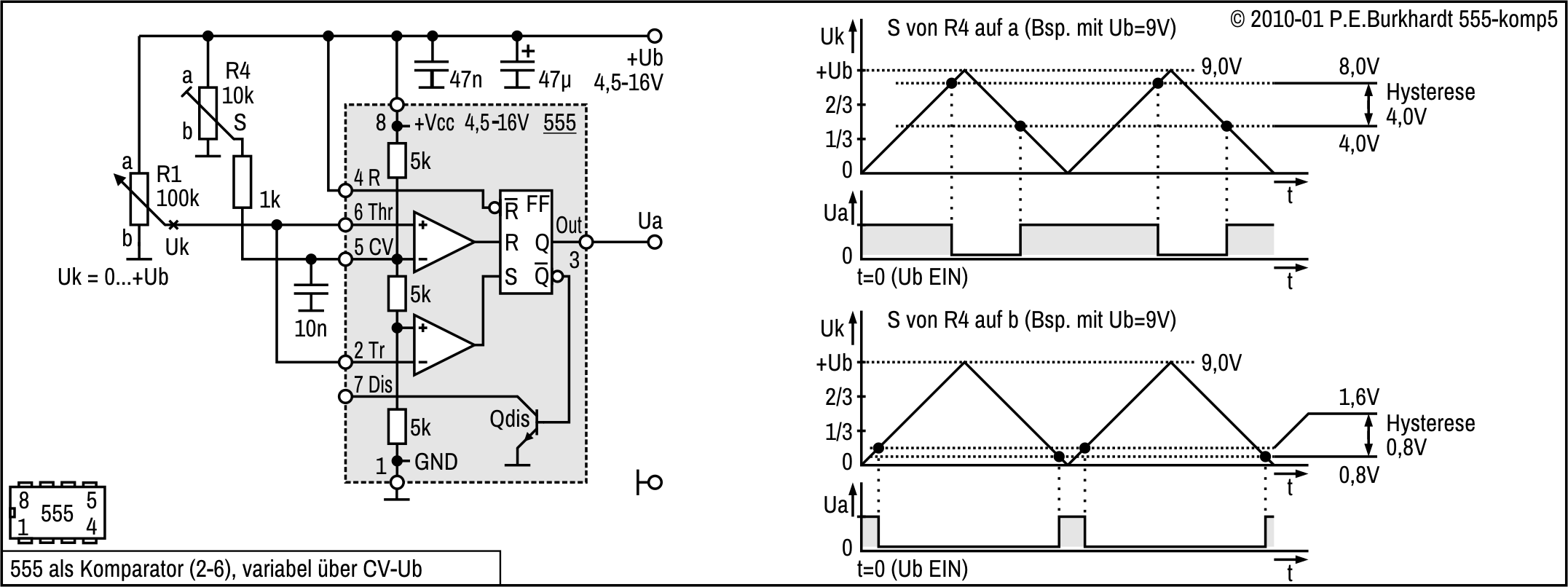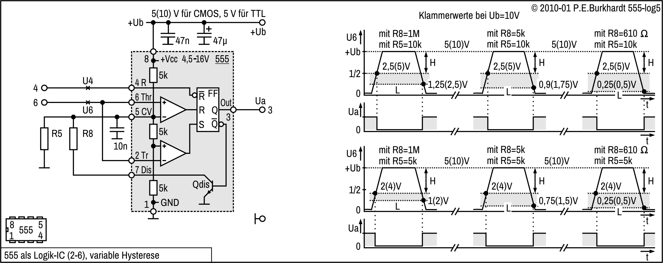 Zur Verschiebung der U6-Schaltschwelle vom 2/3-Wert auf 1/2 von Ub ist R5 vorgesehen. Damit ist ein symmetrisch zu den CMOS-Logikpegeln liegender Hysteresebereich möglich. Die Diagramme im Bild enthalten Hysterese-Werte für 5 V und 10 V Betriebsspannung. Die Schaltung ist natürlich wie 555-üblich von 4,5 bis 16 V einsetzbar.