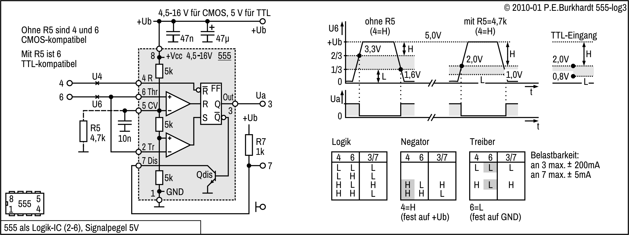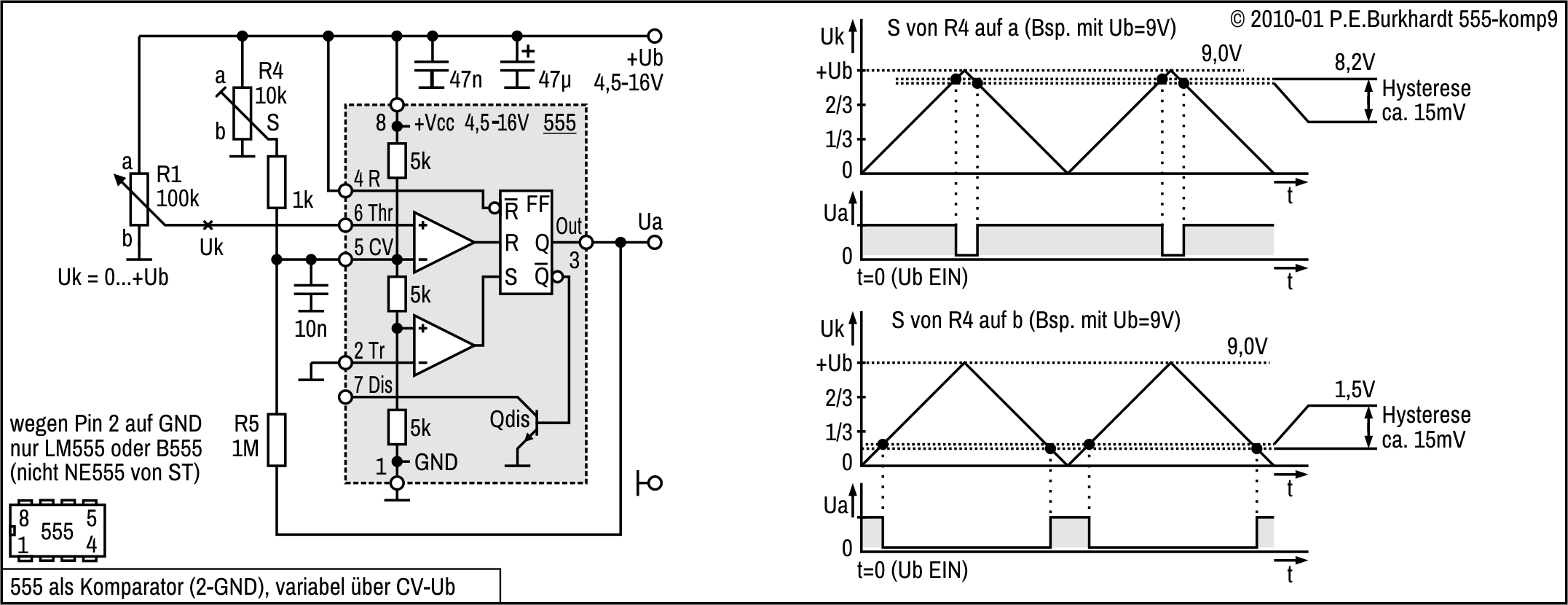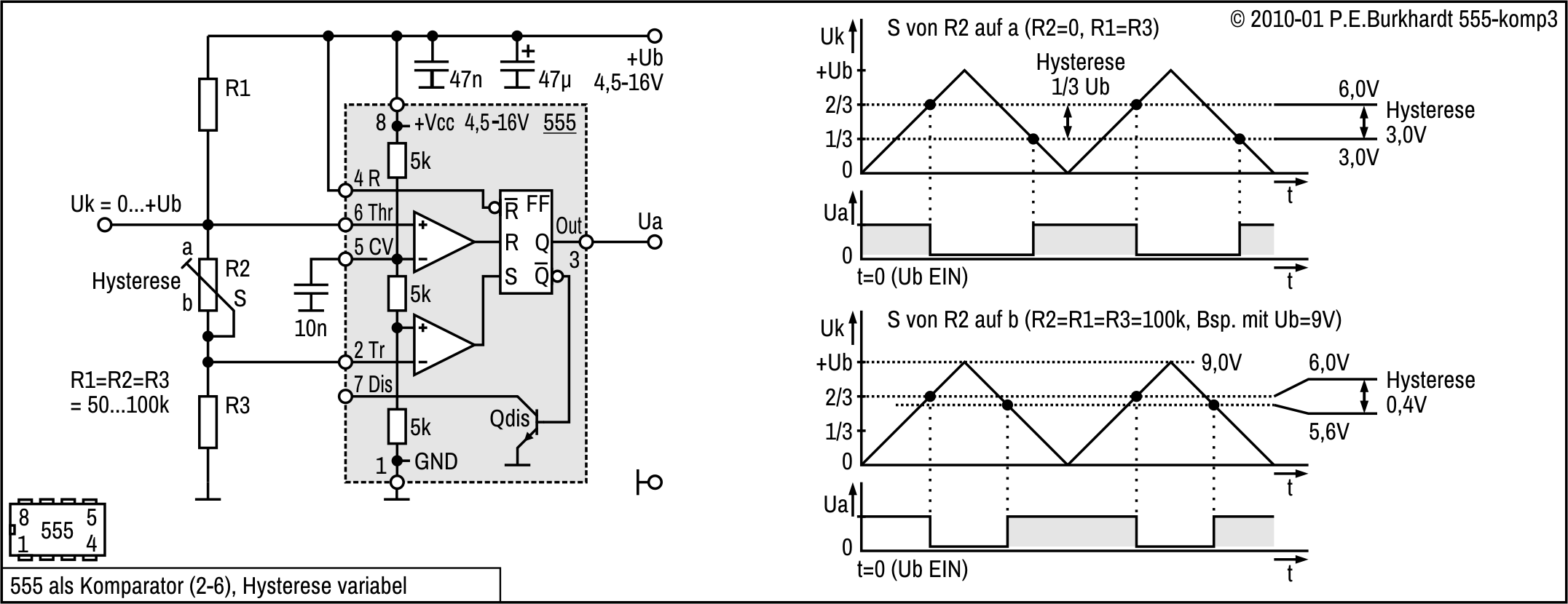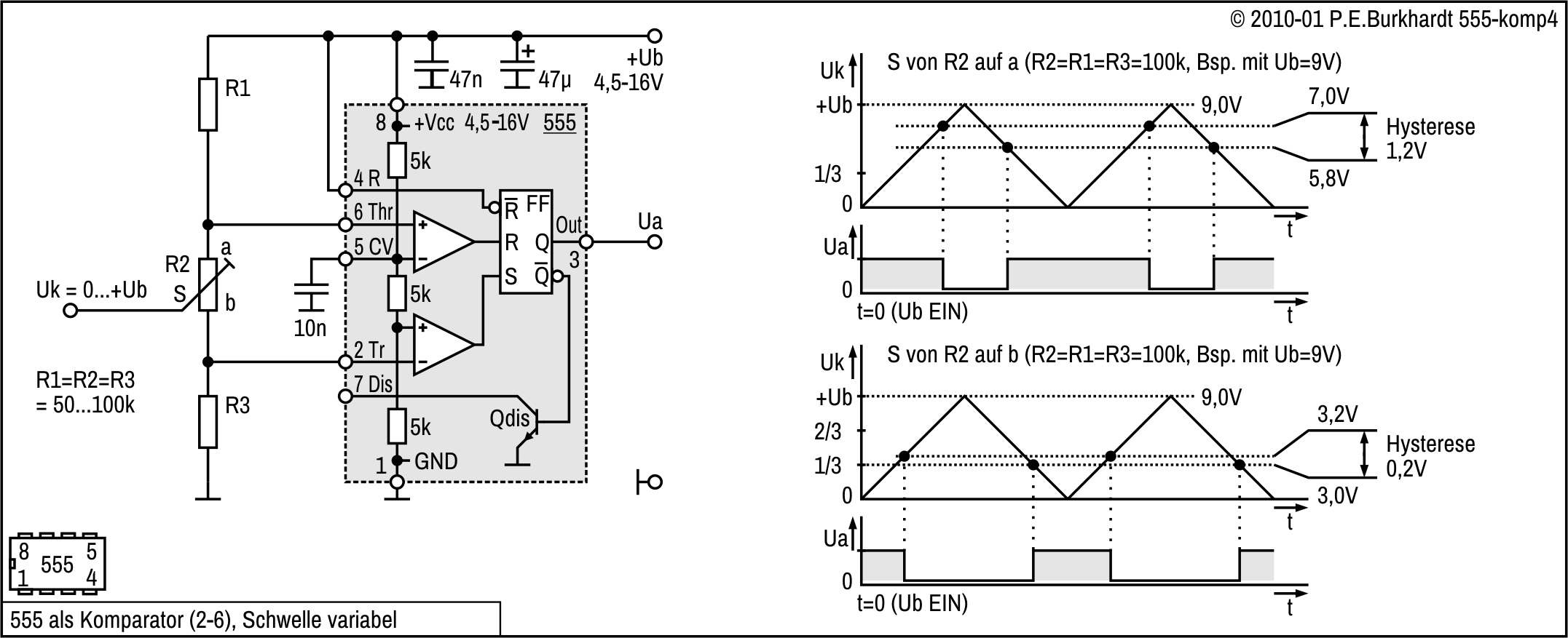 Zur Verschiebung der U6-Schaltschwelle vom 2/3-Wert auf 1/2 von Ub ist R5 vorgesehen. Damit ist ein symmetrisch zu den CMOS-Logikpegeln liegender Hysteresebereich möglich. Die Diagramme im Bild enthalten Hysterese-Werte für 5 V und 10 V Betriebsspannung. Die Schaltung ist natürlich wie 555-üblich von 4,5 bis 16 V einsetzbar.
