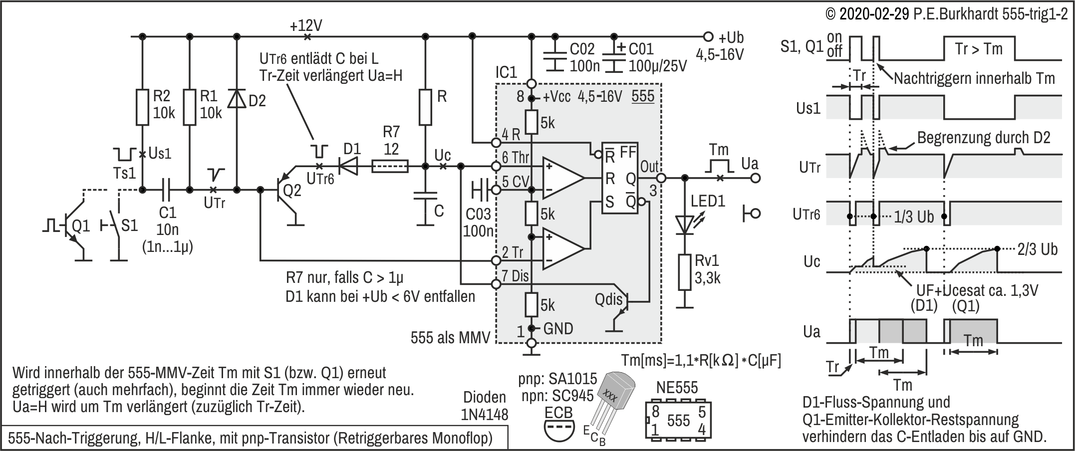 Zur Steuerung des pnp-Transistors am Trigger-Eingang muss ein Strompfad nach GND existieren. Der Steuerstrom fließt aus dem 555 heraus. Der Widerstand R2 stellt den Ersatzwiderstand der Schaltung am Pin 2 nach GND dar. R2 darf maximal so groß sein, dass der minimal notwendige Steuerstrom -I2 bei 1/3 von Ub (Spannung über R2 im Umschaltpunkt 1/3 von Ub) noch fließen kann. Das Bild enthält die Berechnungsformel. Bei I2max = 2 µA (Datenblatt) und Ub = 15 V wären das maximal 2,5 MΩ für R2.