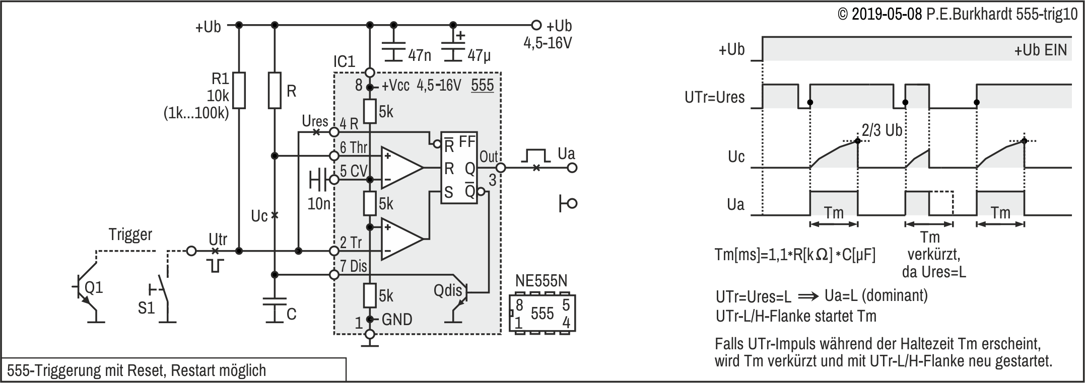 Auch der Triggereingang ist unwirksam, da die Spannung am Pin 2 über 1/3 von Ub liegt, d.h. das interne FF wird über S nicht gesetzt.