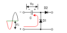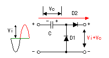 In the period with the negative voltage of the input alternating current signal, the electric charge is stored up to the capacitor (C) through D1. With this, the voltage of the both edges of the capacitor becomes Vc.
