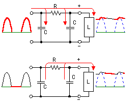 As for the DC voltage which is output from the voltage amplification rectification circuit, the half wave was rectified. So, the ripple is contained in the output. The ripple filter circuit is used to make this ripple little. The circuit this time is using the resistor instead of the coil. Therefore, the output voltage falls at more when the output current increases.