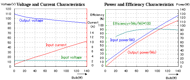 I will report the performance evaluation result of the inverter which was made this time. As the test bed, a battery for the car is used for the power supply and bulbs are used for the load. The internal resistance of the battery is very low and the big electric current (more over 100A) flows through the terminal when short-circuiting. So, you must not make short-circuit absolutely. ![]() I measured the input voltage, the input electric current, the output voltage when changing the wattage of the bulb of the load. The output voltage falls when making a load big. The consumption electric power of the bulb changes with the voltage. So, I am converting to the consumption electric power according to the change of the voltage. In this case, I assume that the resistance value of the bulb doesn't change. However, the resistance value of the bulb changes with the consumption electric power. So, the result has errors by this conversion. Also, the voltage and the current are not sine wave. The result has more errors. However, I judged that these errors didn't have a big influence on the result.
