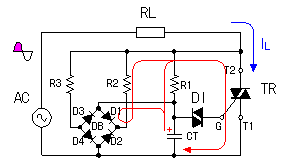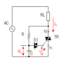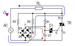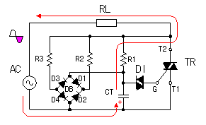 It is necessary to make discharge as fast as possible by the electric charge which was stored up at the capacitor(CT) for the timing after the bidirectional triode thyristor(TR) becomes ON. Otherwise, the electric charge which was stored up in the CT has an influence on the trigger timing of the next cycle. Below, I explain the situation that the input voltage switches over from the positive condition to the negative condition. ![]() When TR becomes the ON condition, as for the voltage between T2 and T1 of TR, it falls to about 1.5 V. When R1 is small, the electric charge of the CT is discharged through R1 and TR. When R1 is big, it is discharged through D1, R2 and TR and the both edge voltage of CT going down. When the trigger timing is early(When the ON time of the bidirectional triode thyristor is long), the voltage of the CT falls sufficiently. However, when the trigger timing is late(When the ON time of the bidirectional triode thyristor is short), it isn't possible to discharge sufficiently in the electric charge of the CT. ![]() Therefore, it discharges rapidly with D1 and D2 when the input voltage becomes the opposite direction. D2 becomes the ON condition when the input voltage becomes negative. When the voltage of the A point is higher than the B point, both of D1 and D2 become the ON condition. When the diode is in the ON condition, the electric current can flow through the opposite direction, too. Because it is, the electric charge of the CT is discharged through D1 and D2. Because the forward voltage of the diode is less than 1 V, the voltage of the both edges of the CT falls immediately to about 1 V. In the following half cycle(the side of the negative), the electric charge of the opposite polarity begins to be stored up in the CT. Therefore, the A point becomes lower than the B point and D1 becomes the OFF condition. Therefore, the speed that the electric charge is stored up in the CT is decided only by R1. After that, the electric charge is