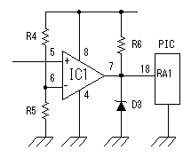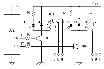 to receive.At the circuit this time, it identifies a control code in the existence in the electric wave. It makes the output of the voltage comparator H level condition if receiving an electric wave and it makes it an L level condition if not receiving. Slightly positive voltage is applied to the negative terminal of IC1 to prevent from a malfunction by the noise. It uses 10 k-ohm for R4, 100 ohm for R5 and the power supply voltage is 12 V. So, the voltage of the negative terminal is 12x100/(10000+100)=0.12 V. Probably, because there is no noise, a negative terminal may ground. When the output voltage (the positive terminal input) of the detection circuit becomes higher than the voltage of the negative terminal, the output of the voltage comparator becomes H level. Because a Zener diode (for 5 V) is connected with the output, the H level is 5 V. This voltage doesn't exceed the permission voltage of PIC. ![]() It puts a vibrator to make do the operation of PIC. A correct oscillation frequency is gotten when there is a crystal oscillator as the vibrator. This time, I used the resonator which used a ceramic. Because to make do the high-speed operation of PIC isn't necessary at the circuit this time, the oscillation frequency is 4 MHz. ![]() RB5 and RB7 port of PIC make do the operation of the relays. It is converting the output voltage of PIC with the transistor. It makes LED light up to find the operation of the relay. It puts a resistor in the LED in series and it is limiting the electric current which flows through the LED to about 10 mA. It is putting a diode in parallel with the relay. When the drive electric current of the relay passes away, the back electromotive force occurs to the coil of the relay. A transistor is prevented from the high voltage by passing the electric current of the back electromotive force to this diode. Because the relay to be using this time is small, there are few gravities that the transistor breaks even if it doesn't put a diode. I put it for the safety. ![]() 3 terminal regulator is used to make the stable +5V voltage which PIC needs from 12V power. It is enough in the 100mA type because it uses for PIC only. |
