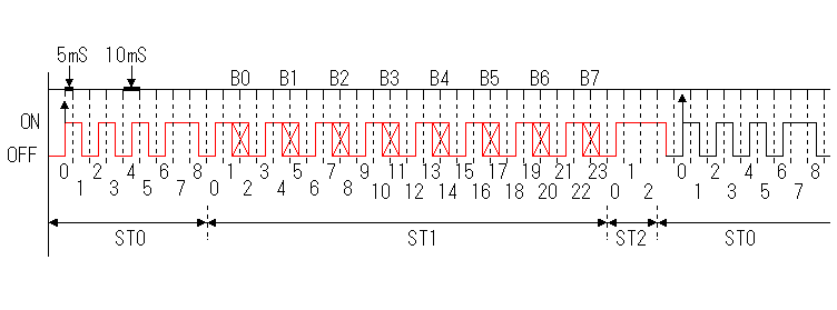 the signal. The electric wave which is sent from the transmitter is composed of three blocks. In the program, it is managing three blocks by receiving status (RX_STATUS). ST0, ST1, ST2 show receiving status with the figure above. A bit in each block is managed by sub status (RX_SUBSTATUS). The figure which is written under the signal in the figure above shows sub status. When detecting the signal which doesn't match above-mentioned composition, the detection operation returns first and begins with the condition of the existence confirmation of the electric wave. First, the detection operation of the preamble signal is done. It detects ON-OFF three times, and it detects the ending mark (being OFF behind twice continuously ON) of the preamble and it is judged a normally preamble signal. It makes status "1" when receiving a normally preamble signal and the detection of the control code is done. Each bit of the control code is between the ON signal and the OFF signal. It is stored in CONT_DATA every time it detects each bit. It makes status "2" when receiving all of the 8 bits normally and it confirms an ending code. The ending code is a three times continuously ON signal. When receiving an ending code normally, the checking of a received control code is done. It is checked with the beforehand registered control code. As a result, the RB port which corresponds to the control code is controlled. When finishing receiving above signal normally, it makes the condition of the existence confirmation of the electric wave like the time of the receiving start-up. Receiving timing is set once again by this. The clock of the transmitter and the clock of the receiver aren't the same. So, when receiving long in the same timing, the timing shifts and sometimes becomes that it isn't possible to receive. If detecting the standing-up of the signal every time it receives each frame, the receiving timing doesn't shift. Only the case to become ON condition from the OFF condition is detected because it is using the last Look for the standing-up detection of the signal. |