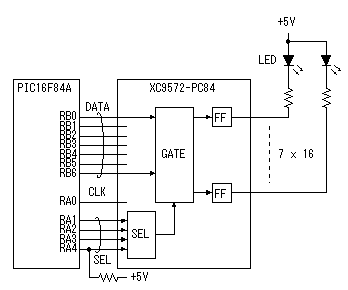 ![]() The lighting-up condition of the LED is held with the latch register of CPLD. The lighting-up data of 7 bits(For one row) is output from PIC. A row is specified by the RA port. Latch of the data is done in the falling edge of the clock signal which is output from RA4. Two XC9572-PC84 are used for 112 LEDs to latch. RA4 is different from the other RA ports and must put a pull-up resistor outside.