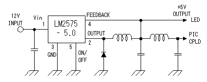 ![]() The voltage which is applied to the terminal of CPLD is upto 5V. So, the voltage of the LED must be made 5V too. The current of each LED is 10 mA. So, when all LEDs light up, the total current is about 1.2 A. At this equipment, an AC adapter is used to make a power unit compact. Because 12V/1A (12-W type) could be cheaply obtained, I used 5V voltage switching regulator. For the power to PIC and CPLD, the 2nd filter is used. This filter is put to reduce the ripple. This switching regulator circuit is the circuit to be introducing on "+5V Switching regulator (1)". The maximum current of LM2575 is 1A. When all LEDs are lit up, the required current is over 1A. But if not making all LEDs is lit up for long time, there is no problem. | |||||||||||||||||||||||||||||||||||||||||||||||||