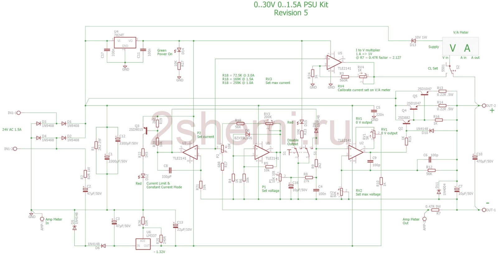 0-30 V güç sağlayabilen bir laboratuvar güç kaynağı için çok popüler bir güç kaynağı devresi, bazı Çinli tedarikçilerin PCB de dahil olmak üzere tüm detayları içeren bir kiti yaklaşık 10 $ gibi cazip bir fiyatla piyasaya sürdüğü ilgi çekiciydi. İşte bu ayarlanabilir güç kaynağının orijinal şeması: