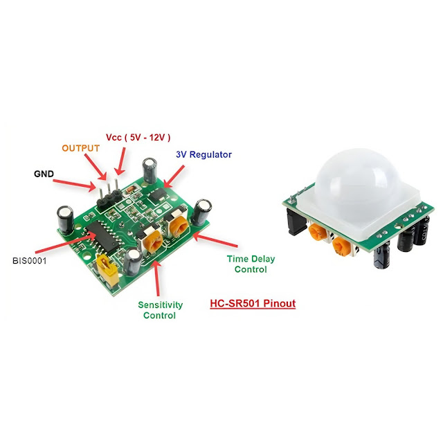 HC- SR501 PIR Sensörünün, üç çıkış pini vardır. Bunlar; VCC, OUT ve GND pinleridir. Dahili bir voltaj regülatörüne sahiptir, bu sebepten dolayı 4,5 V ile 12 V arasında herhangi bir DC voltajı ile çalıştırabilirsiniz, fakat tipik olarak 5V kullanılır.