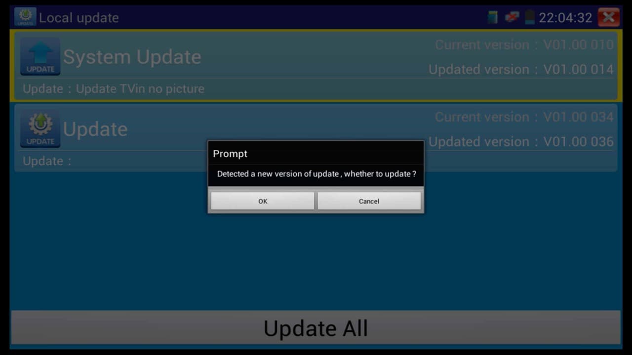 6. Then select the Local Update, you will then be notified that there is a new version of the firmware, click OK to continue. (Shown Below)