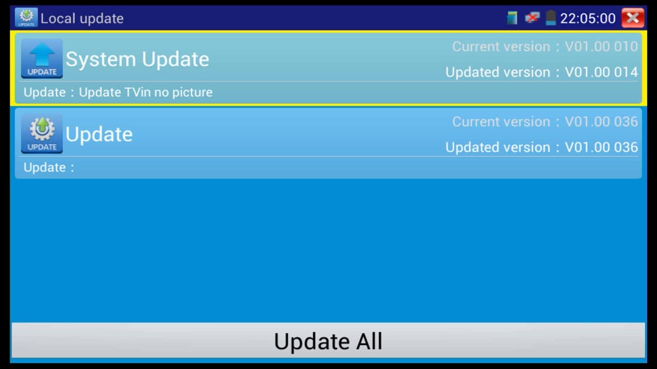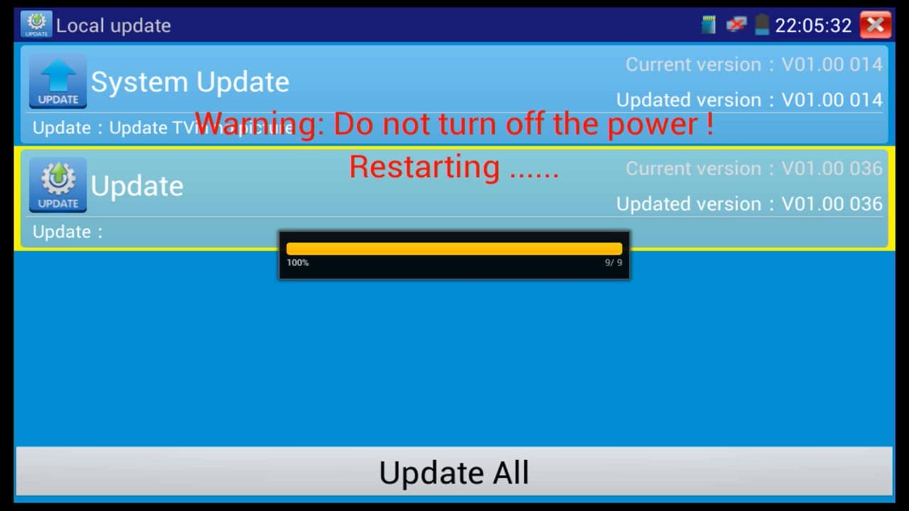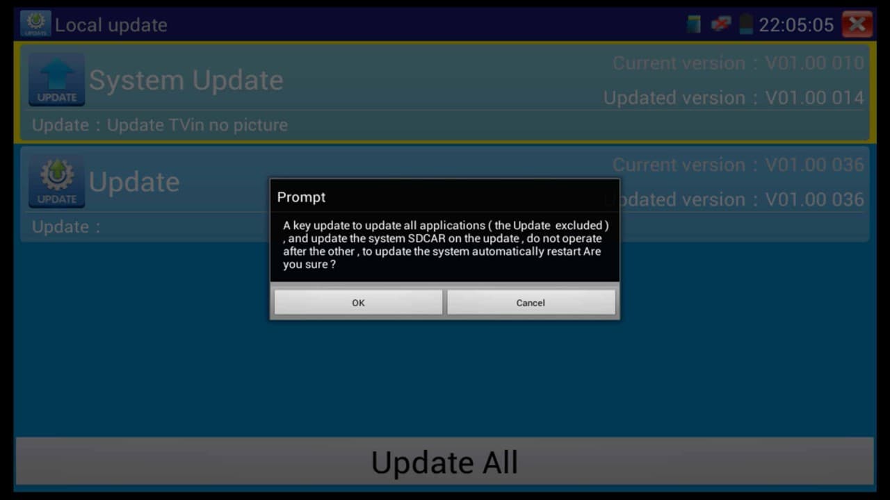 7. On the Local Update menu, press the Update All button to begin the update process. You will then be prompted to restart the test monitor, press OK to continue. (Shown Below)