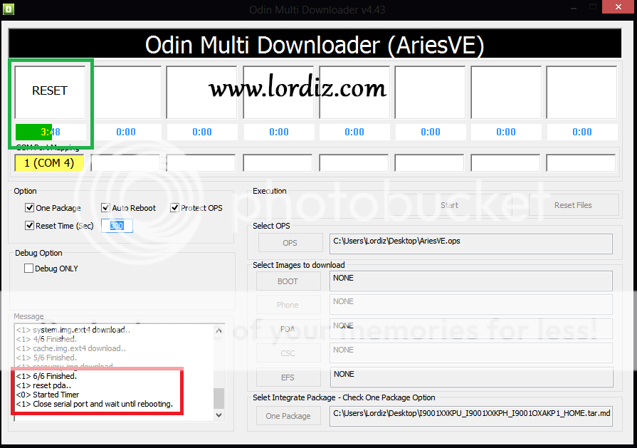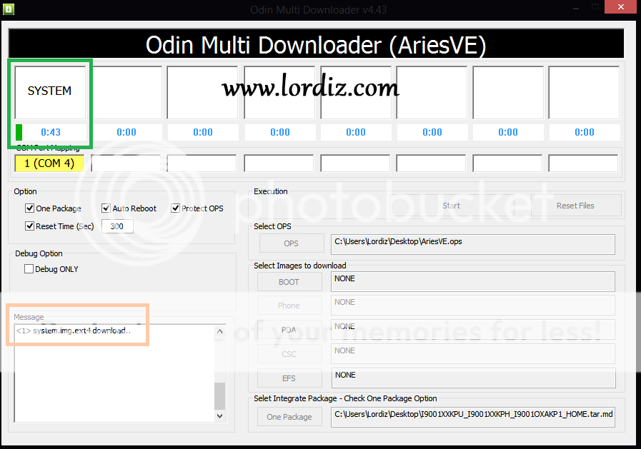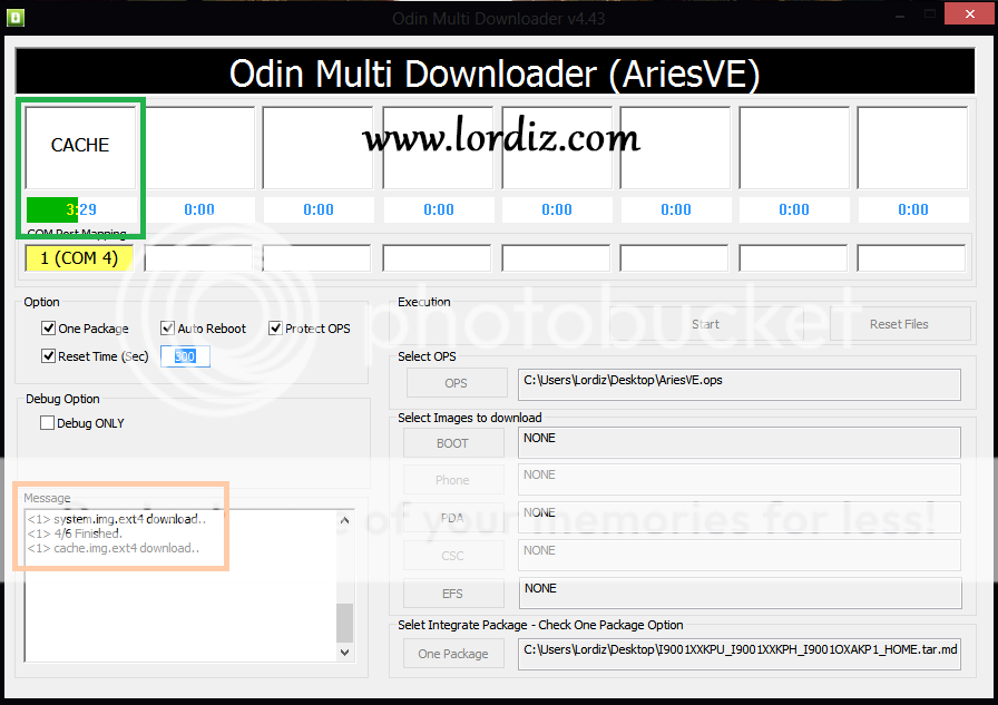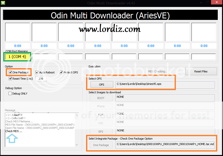 4. Odin telefonu görüp sarı port rengini aldıysa şimdi Select OPS bölümündenArisve.ops dosyasını seçin, sol taraftan One Package'e tik koyun ve sağ alttakiOne Package'den tar.md5 uzantılı orijinal rom dosyasını seçin.
