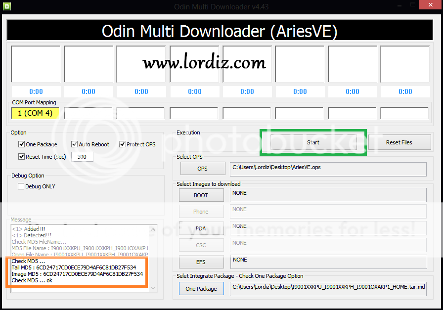 5. Odin rom dosyasını analiz edecek bu süreçte sağ üstteki Start butonu pasif olur. Eğer start butonu aktif olduysa analiz bitmiş ve dosya sağlam çıkmış demektir. Şimdi yüklemeyi başlatın yani Start butonuna basın.