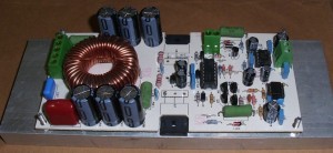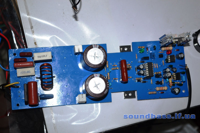 Привет! Эту схему удобнее собирать на чуть увеличенной печатной плате, чтобы уместился дроссель (хотя бы для 100 ватт мощности). Выходная емкость (при наладке обычно тоже увеличивается в 2-3 раза).