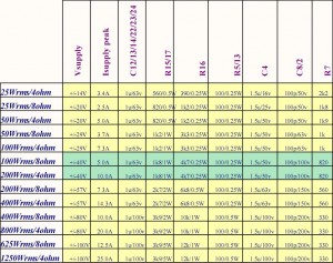 Birkaç yedek parçaya sahip çok fazla 1250W'ınız varsa ve 25 ila 1250 W arasında bir amplifikatör yapılabilirse, tüm bu veriler Tabloda gösterilir, buna göre herhangi bir güç için bir amplifikatör monte edebilirsiniz.