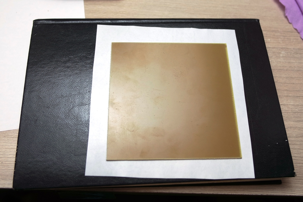 Обезжириваем медь и кладем подложку рисунком вверх на полумягкую поверхность, например книгу: