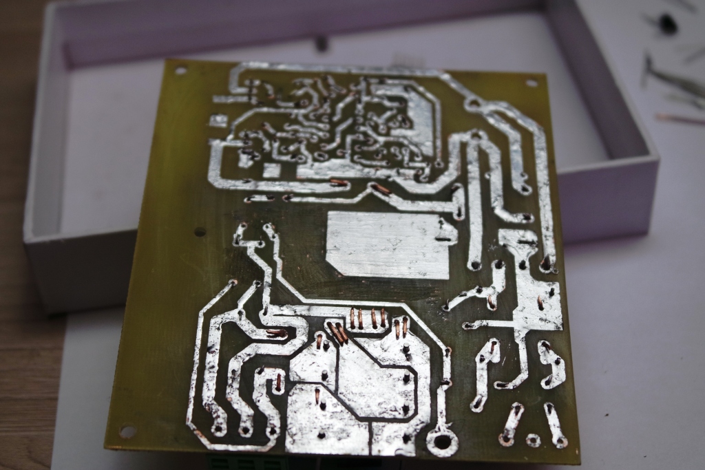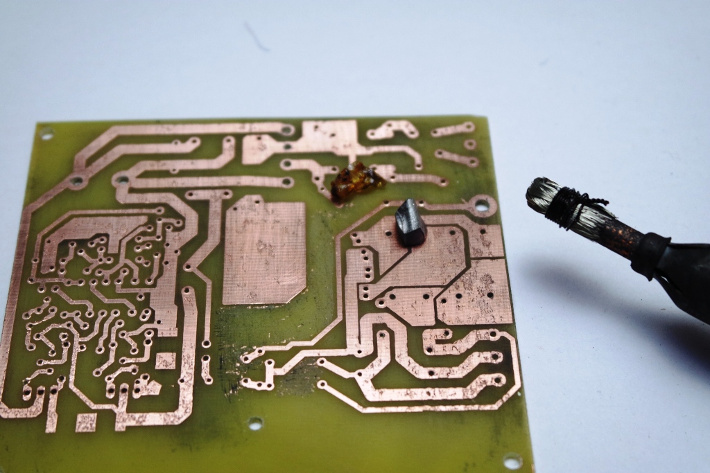 После убираем утюг, приживаем сверху текстолит еще парочкой книг, и даем немного остынуть. Далее подложка легко отрывается, а рисунок остается на медной поверхности: