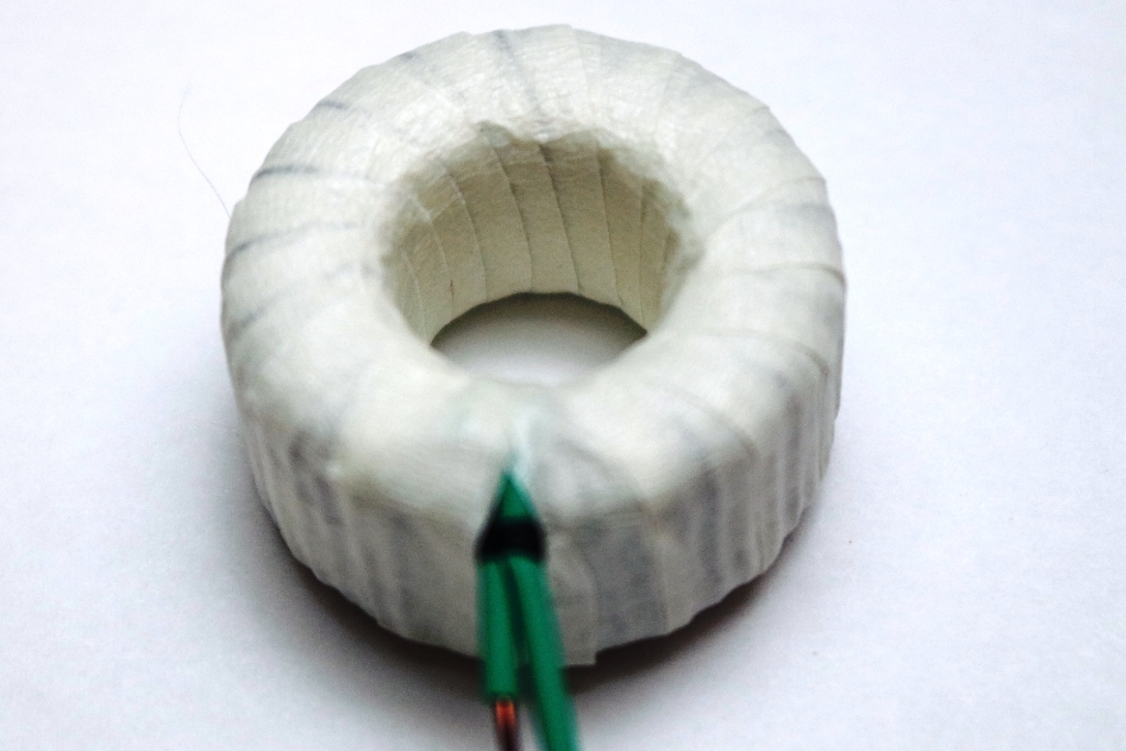 Первичная обмотка содержит 52 витков проводом 0,75мм. Выводы дополнительно изолируются термоусадкой.