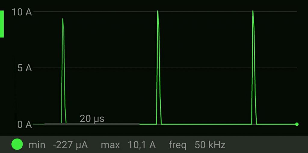 Данная схема отличается от всех остальных тем, что в ней каждый полевик защищен от токовой перегрузки. Принцип работы защиты очень прост, рассмотрим схему управления нижним полевиком. С выхода LO микроcмы IR2153 поступаем меандр амплитудой 12в и частотой 44кГц, через конденсатор С11 и затворный резистор R8 этот сигнал открывает и закрывает полевик. Как только ток через шунт R10 хоть на мгновение превысит значение 7А, зарядится конденсатор С13, транзистор VT2 откроется и разрядит внутреннюю емкость полевика и конденсатор С11. Трансзистор T2 закроется , и может быть открыт только поле следующего сигнала от IR2153. Ток через полевый транзистор будет иметь форму острой иголки (подобие ШИМ с малым заполнением импульса).