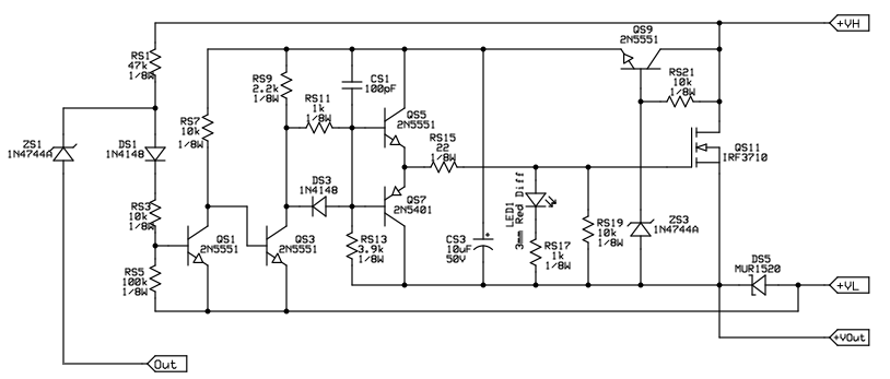 El Zener ZS1, RS1 forman una barrera, de modo que el conmutador no se dispare antes de lo debido, ya que podría provocar pérdidas de eficiencia, el diodo DS1 rectifica la onda proveniente de la salida de audio del amplificador y las resistencias RS3 y RS5 forman un divisor de tensión para asegurar que el transistor QS1 no se active antes de tiempo, cabe destacar que la RS1 mantiene una tensión mínima sobre el Zener ZS1 proveniente esto es para que el disparo siempre sea el correcto sin importar las tensiones de la fuente de poder. El QS1 forma la primera etapa de amplificación que por su forma de trabajar, podría decirse que trabaja en clase C